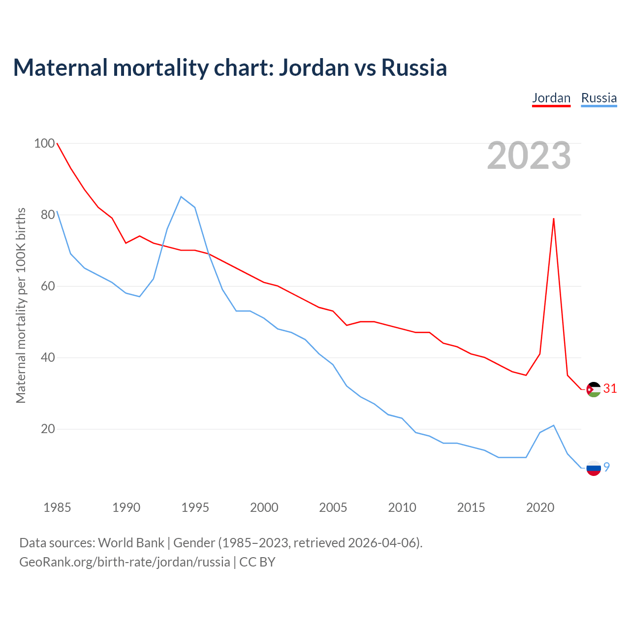 The maternal mortality rate, which is the probability of dying during childbirth or within 42 days of pregnancy termination, is 31 deaths per 100,000 live births in Jordan, compared to 9 deaths in Russia.