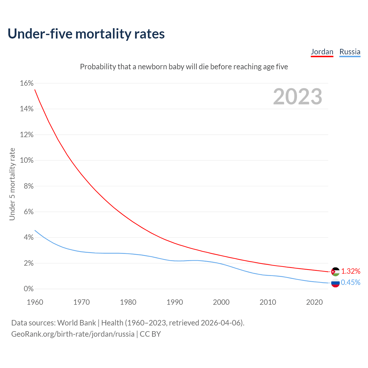 The chance that a newborn baby will die before reaching age five is 1.32% in Jordan and 0.45% in Russia. Above is a chart with historical data on under-five mortality rates.