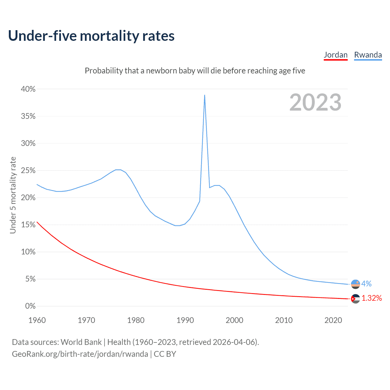 The chance that a newborn baby will die before reaching age five is 1.32% in Jordan and 4% in Rwanda. Above is a chart with historical data on under-five mortality rates.