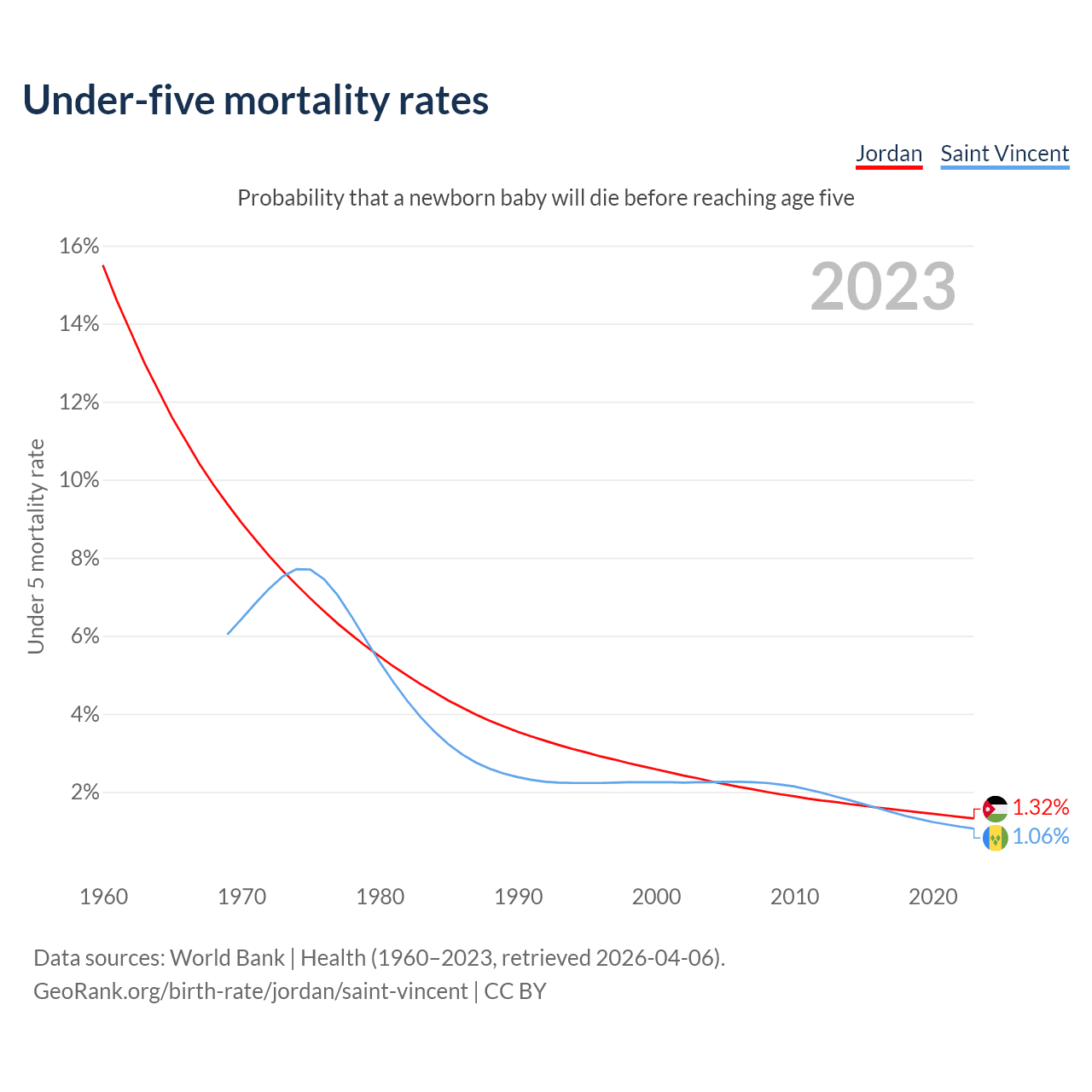 The chance that a newborn baby will die before reaching age five is 1.32% in Jordan and 1.06% in Saint Vincent. Above is a chart with historical data on under-five mortality rates.