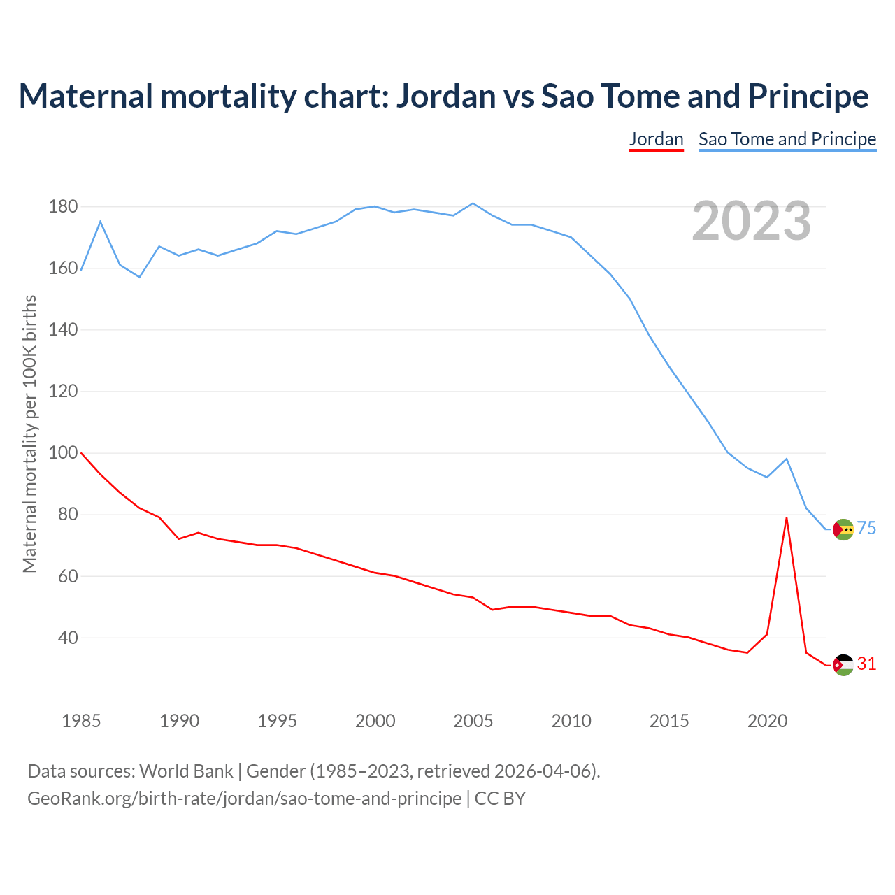 The maternal mortality rate, which is the probability of dying during childbirth or within 42 days of pregnancy termination, is 31 deaths per 100,000 live births in Jordan, compared to 75 deaths in Sao Tome and Principe.