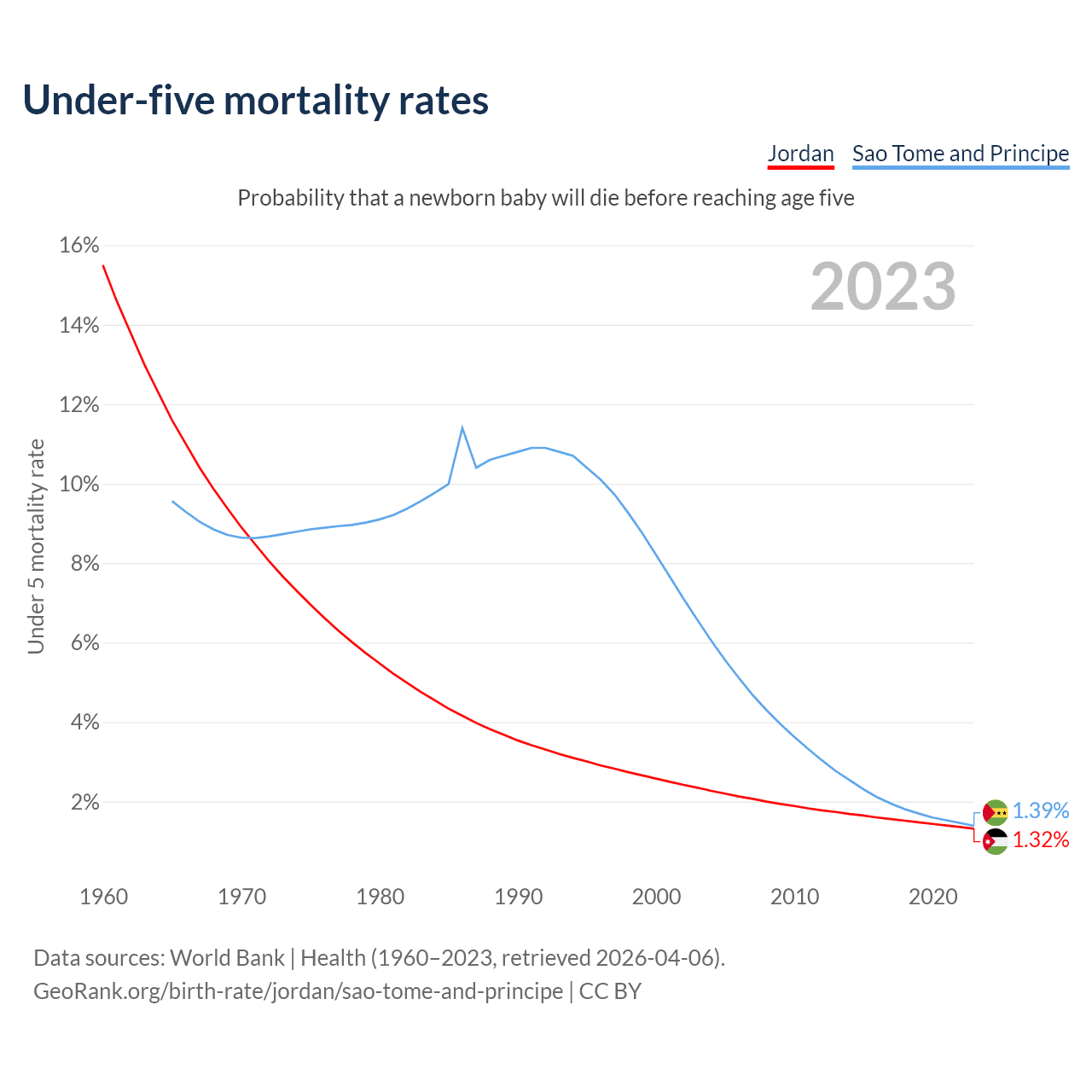 The chance that a newborn baby will die before reaching age five is 1.32% in Jordan and 1.39% in Sao Tome and Principe. Above is a chart with historical data on under-five mortality rates.