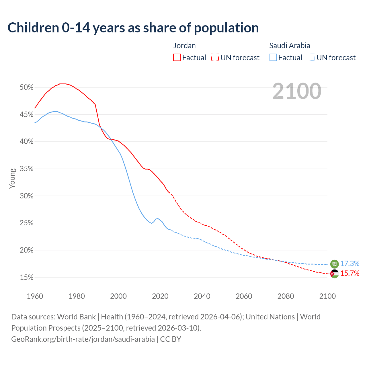 According to the latest available data on birth rates, the fertility rate in Jordan was 2.64 children per woman in 2023, compared to 2.28 in Saudi Arabia in 2023. The replacement level is considered to be 2.1 children per woman.