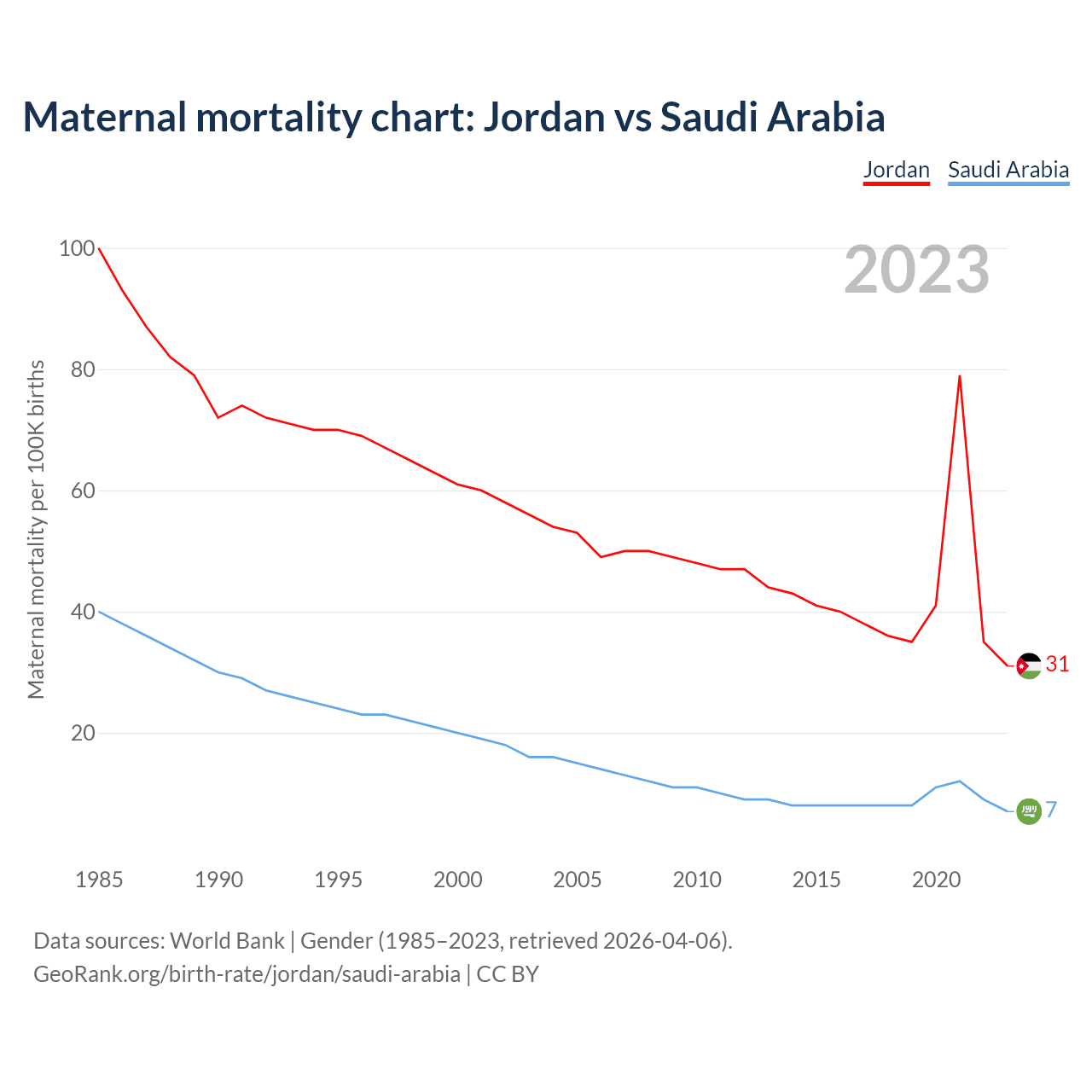 The maternal mortality rate, which is the probability of dying during childbirth or within 42 days of pregnancy termination, is 31 deaths per 100,000 live births in Jordan, compared to 7 deaths in Saudi Arabia.