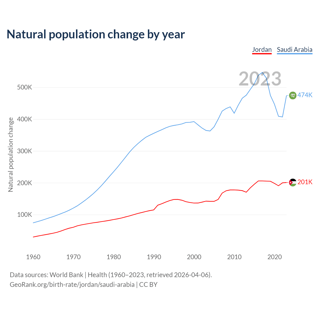 Jordan has an annual birth rate of 20.6 births per 1,000 people, compared to 16.4 for Saudi Arabia. The average number of children a woman is expected to have during her lifetime — the fertility rate, is 2.64 in Jordan and 2.28 in Saudi Arabia — 13.6% difference.