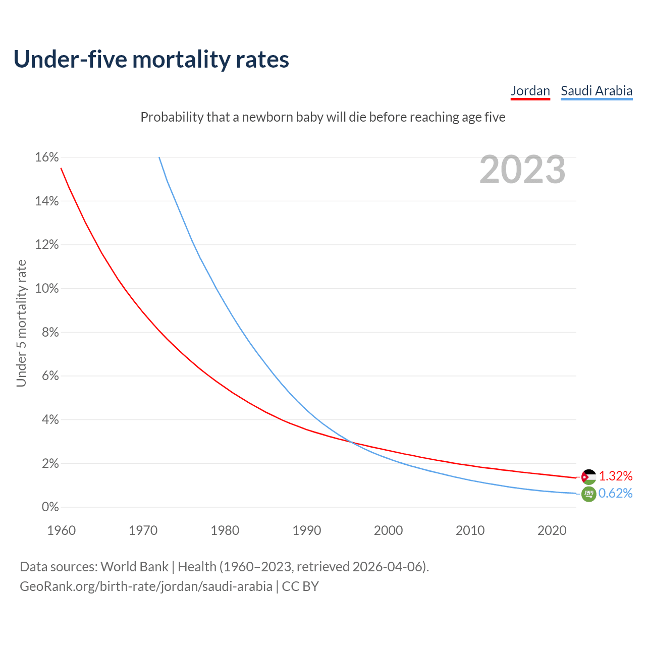 The chance that a newborn baby will die before reaching age five is 1.32% in Jordan and 0.62% in Saudi Arabia. Above is a chart with historical data on under-five mortality rates.