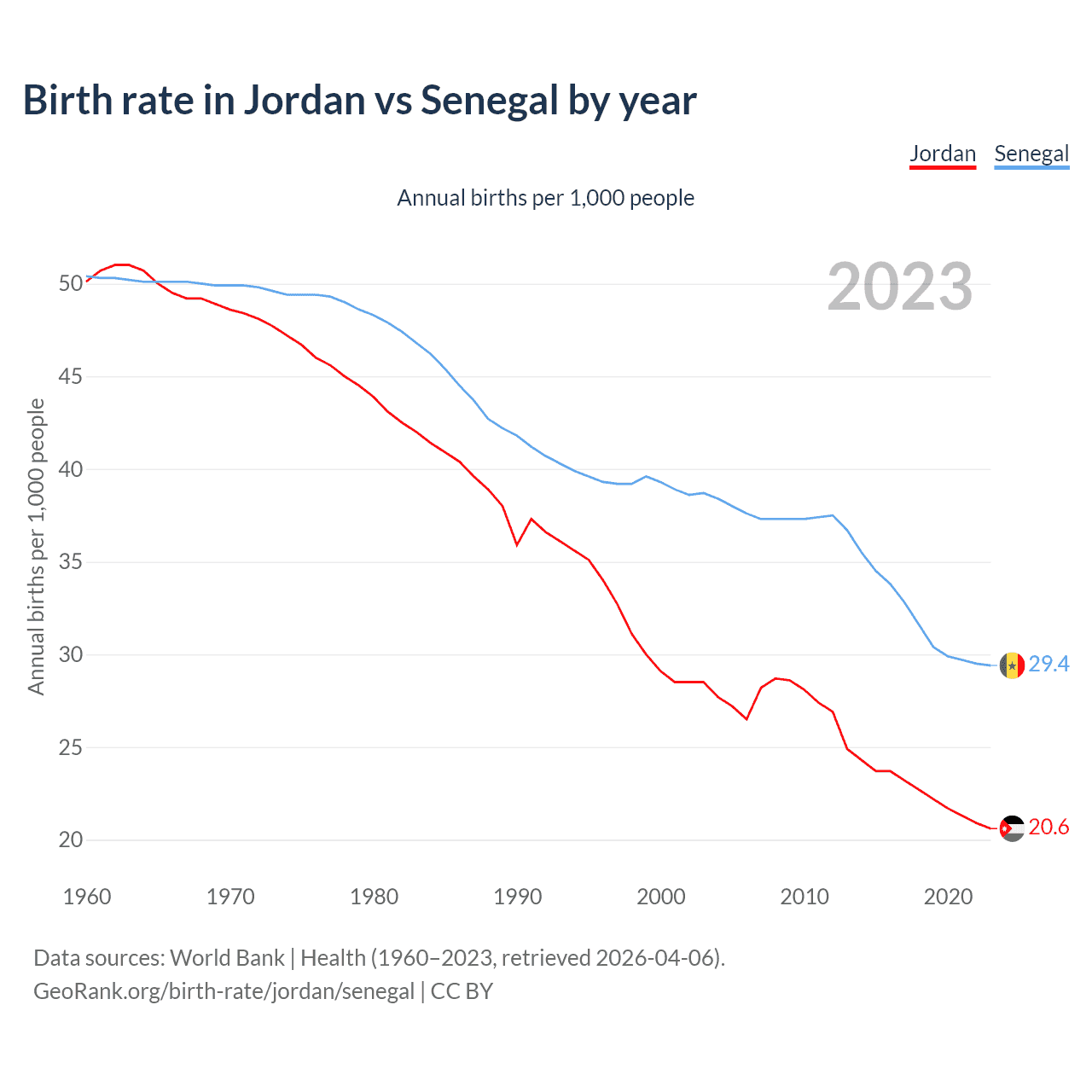 Jordan has an annual birth rate of 20.6 births per 1,000 people, compared to 29.4 for Senegal. The average number of children a woman is expected to have during her lifetime — the fertility rate, is 2.64 in Jordan and 3.82 in Senegal — 44.7% difference.