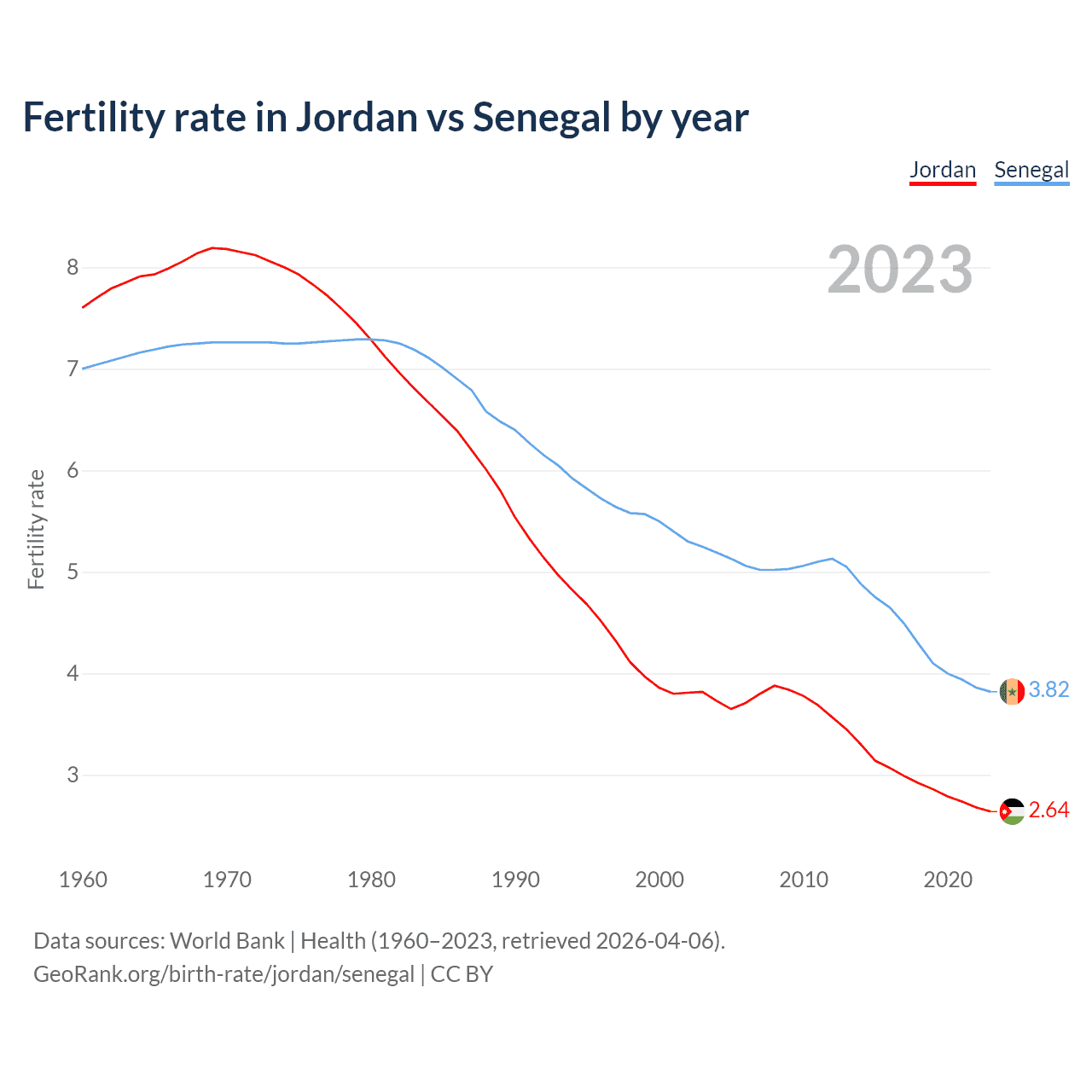 According to the latest available data on birth rates, the fertility rate in Jordan was 2.64 children per woman in 2023, compared to 3.82 in Senegal in 2023. The replacement level is considered to be 2.1 children per woman.