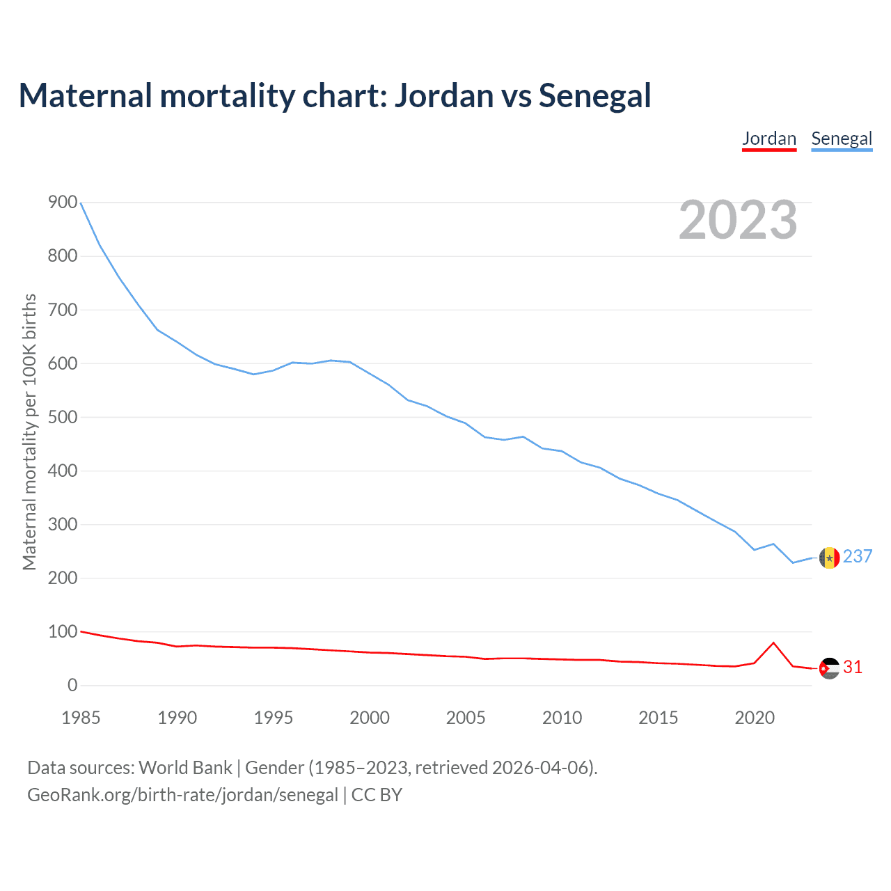 The maternal mortality rate, which is the probability of dying during childbirth or within 42 days of pregnancy termination, is 31 deaths per 100,000 live births in Jordan, compared to 237 deaths in Senegal.