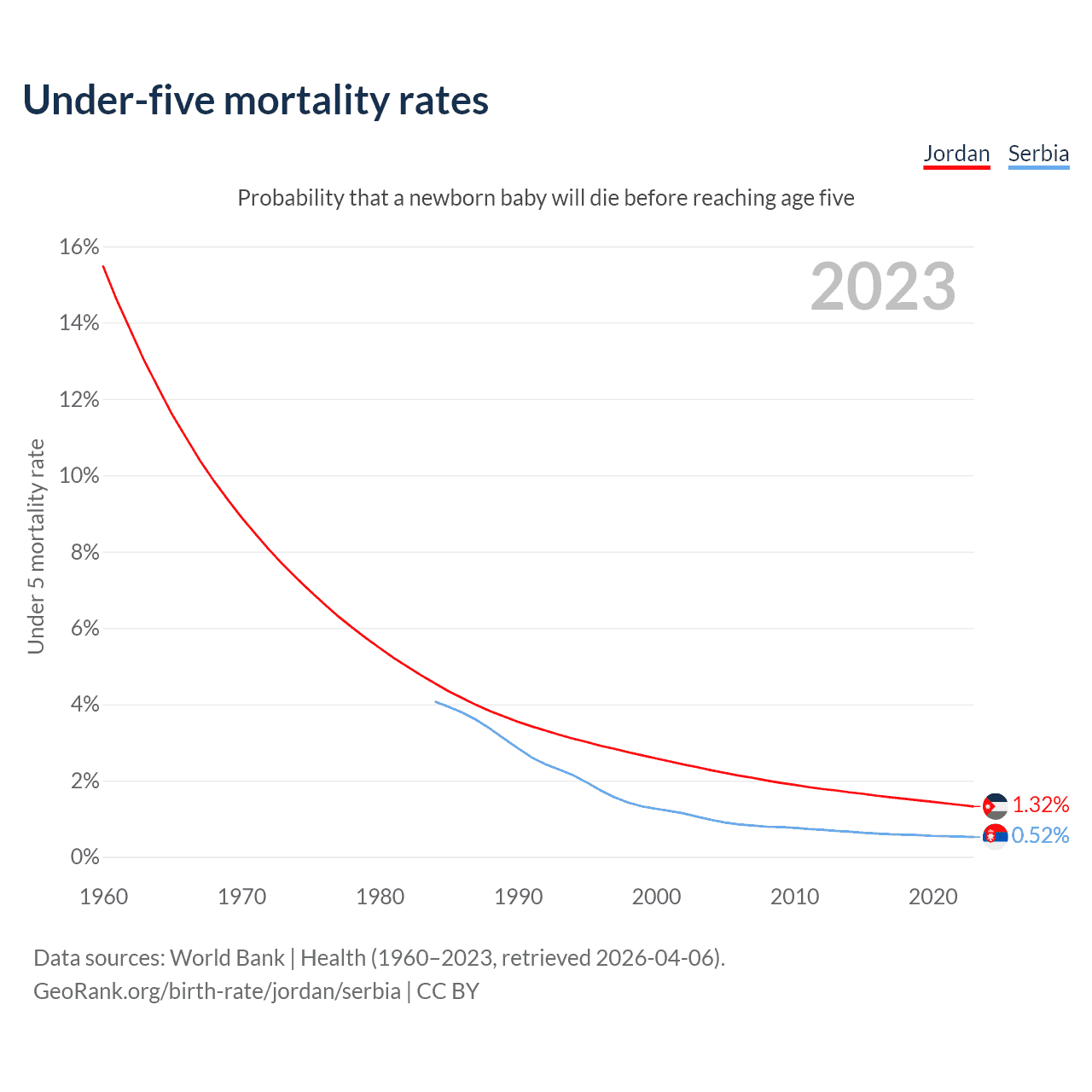 The chance that a newborn baby will die before reaching age five is 1.32% in Jordan and 0.52% in Serbia. Above is a chart with historical data on under-five mortality rates.