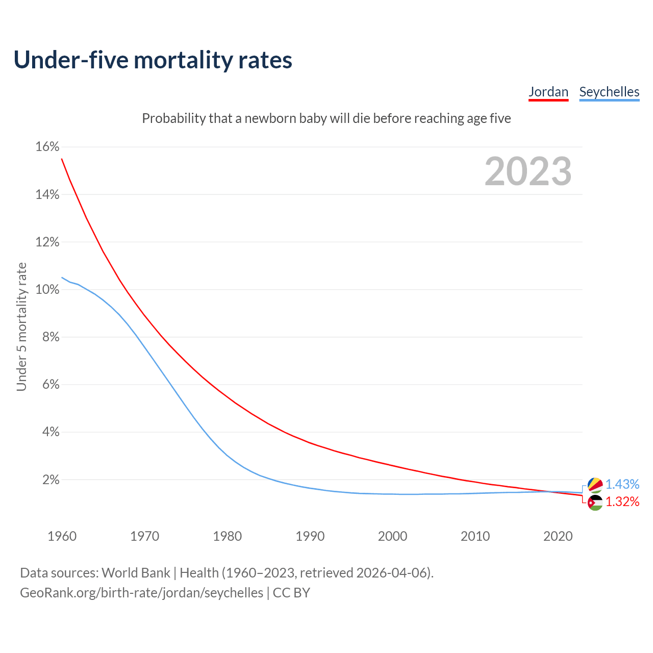 The chance that a newborn baby will die before reaching age five is 1.32% in Jordan and 1.43% in the Seychelles. Above is a chart with historical data on under-five mortality rates.