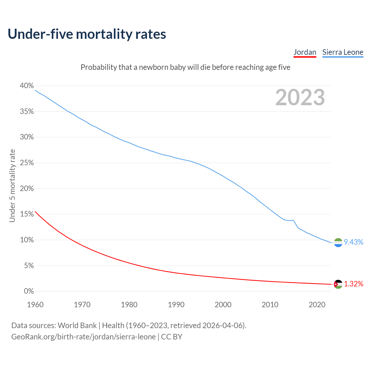 The chance that a newborn baby will die before reaching age five is 1.32% in Jordan and 9.43% in Sierra Leone. Above is a chart with historical data on under-five mortality rates.