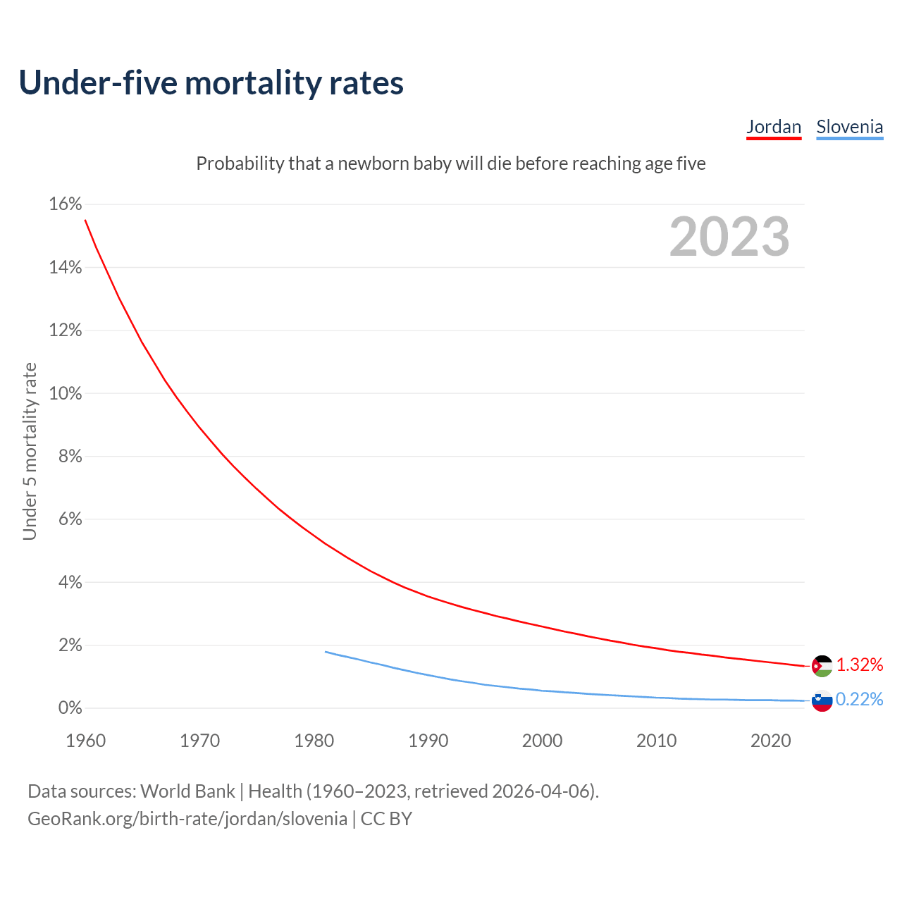 The chance that a newborn baby will die before reaching age five is 1.32% in Jordan and 0.22% in Slovenia. Above is a chart with historical data on under-five mortality rates.