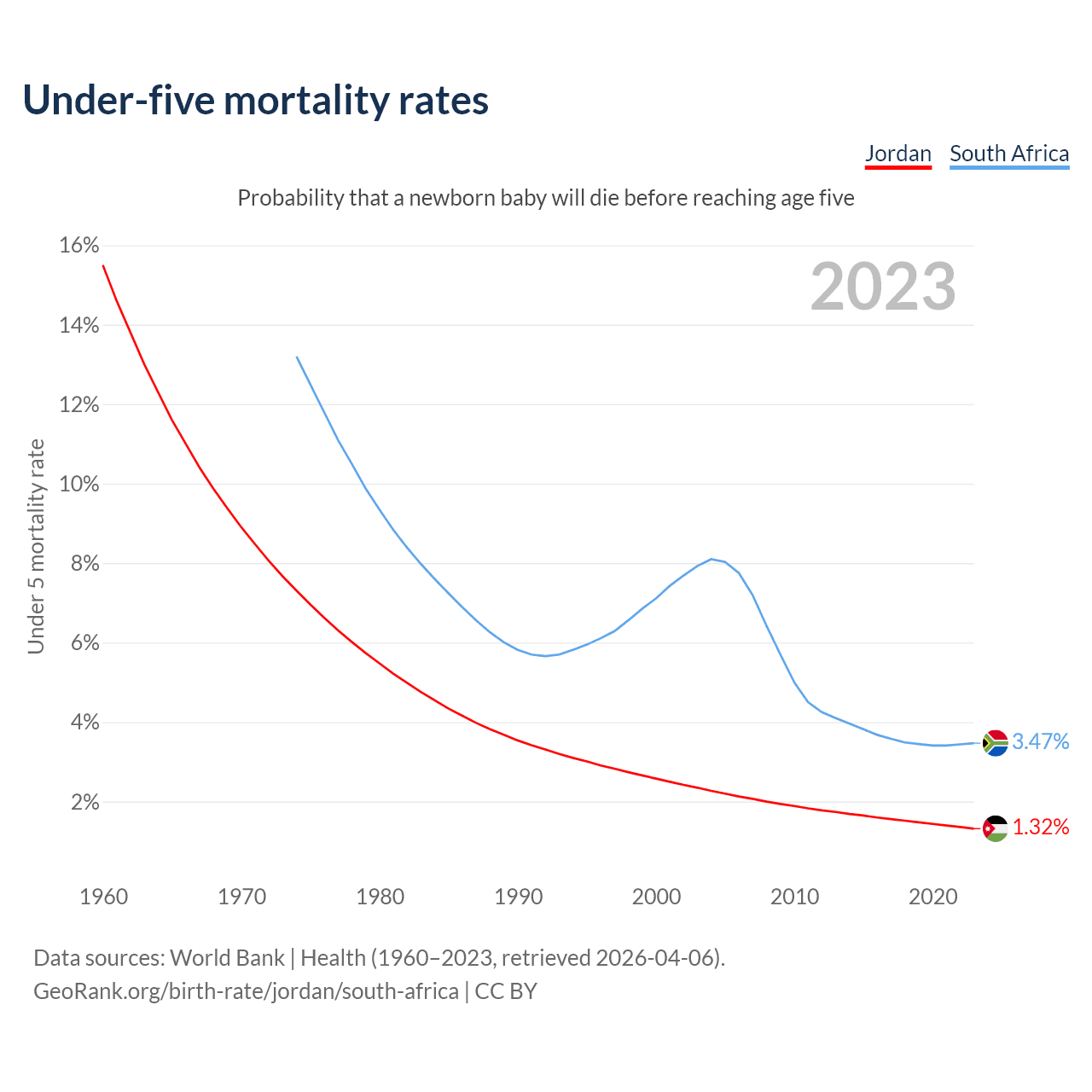 The chance that a newborn baby will die before reaching age five is 1.32% in Jordan and 3.47% in South Africa. Above is a chart with historical data on under-five mortality rates.