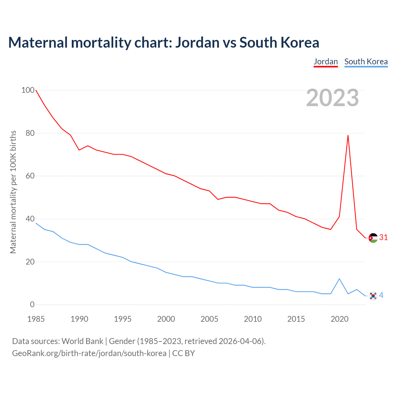 The maternal mortality rate, which is the probability of dying during childbirth or within 42 days of pregnancy termination, is 31 deaths per 100,000 live births in Jordan, compared to 4 deaths in South Korea.