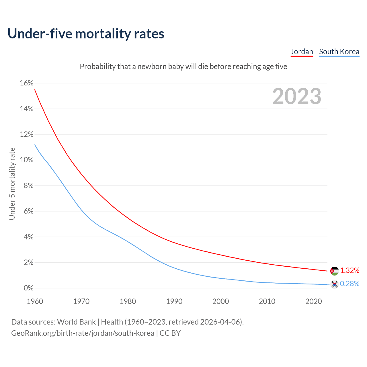 The chance that a newborn baby will die before reaching age five is 1.32% in Jordan and 0.28% in South Korea. Above is a chart with historical data on under-five mortality rates.