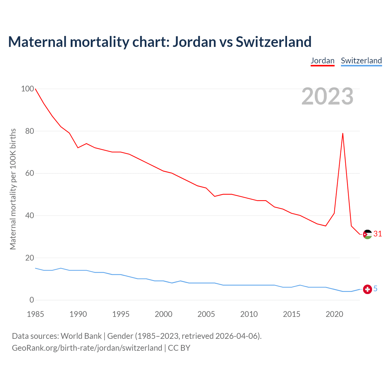 The maternal mortality rate, which is the probability of dying during childbirth or within 42 days of pregnancy termination, is 31 deaths per 100,000 live births in Jordan, compared to 5 deaths in Switzerland.