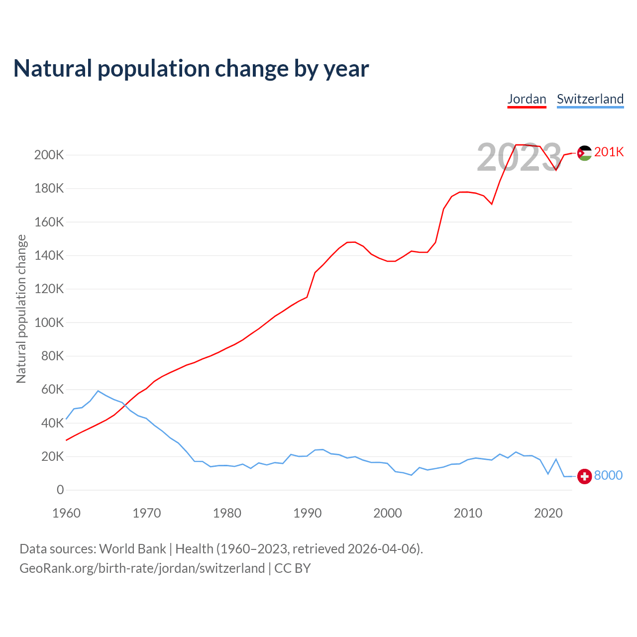 Jordan has an annual birth rate of 20.6 births per 1,000 people, compared to 9 for Switzerland. The average number of children a woman is expected to have during her lifetime — the fertility rate, is 2.64 in Jordan and 1.33 in Switzerland — 49.6% difference.