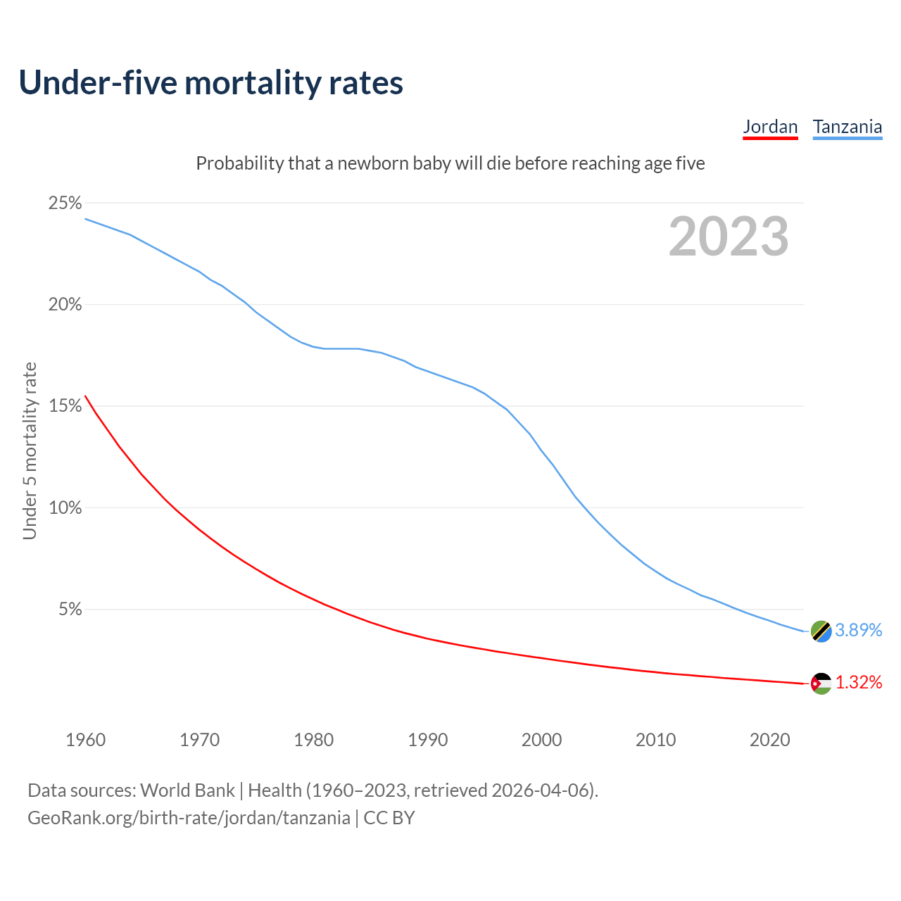 The chance that a newborn baby will die before reaching age five is 1.32% in Jordan and 3.89% in Tanzania. Above is a chart with historical data on under-five mortality rates.