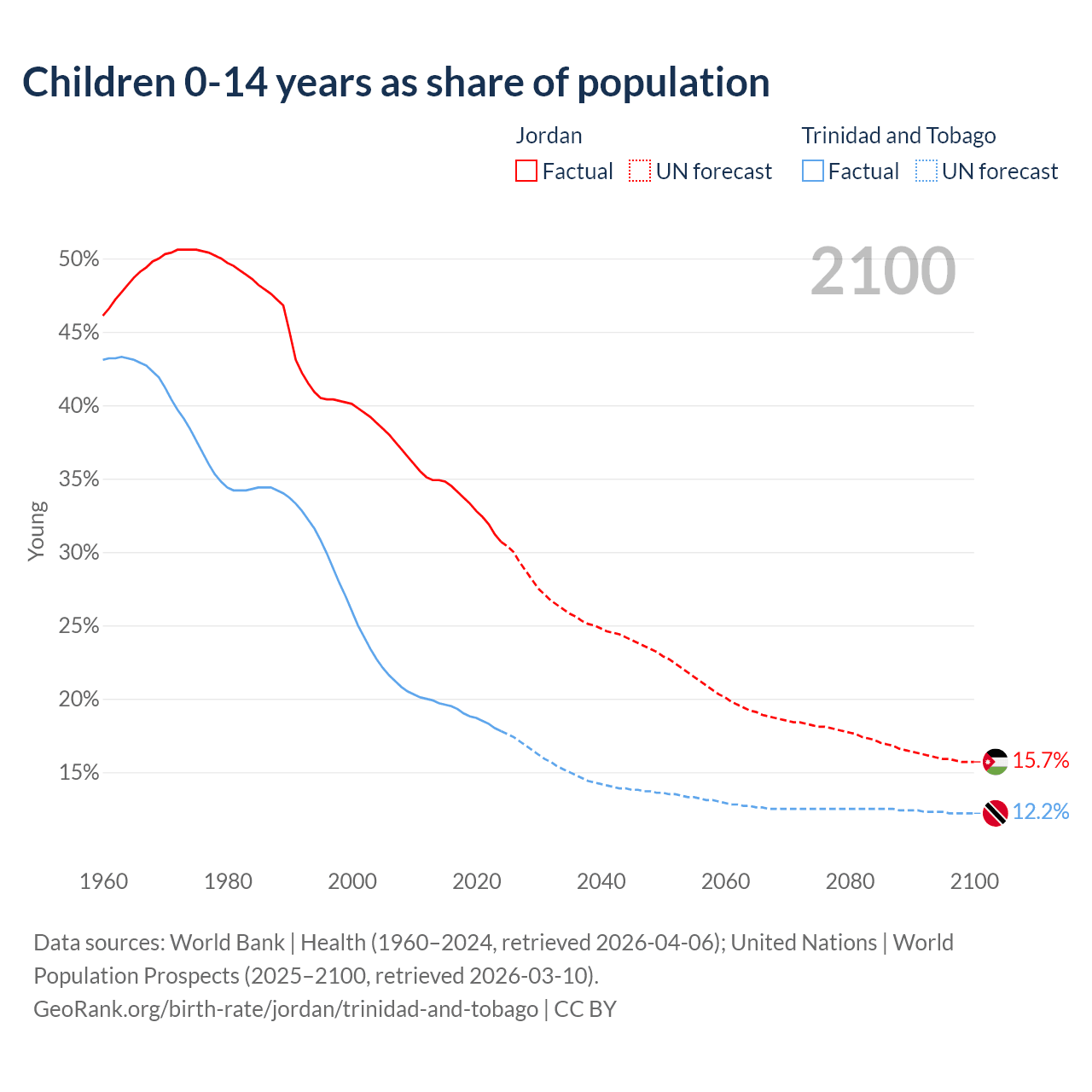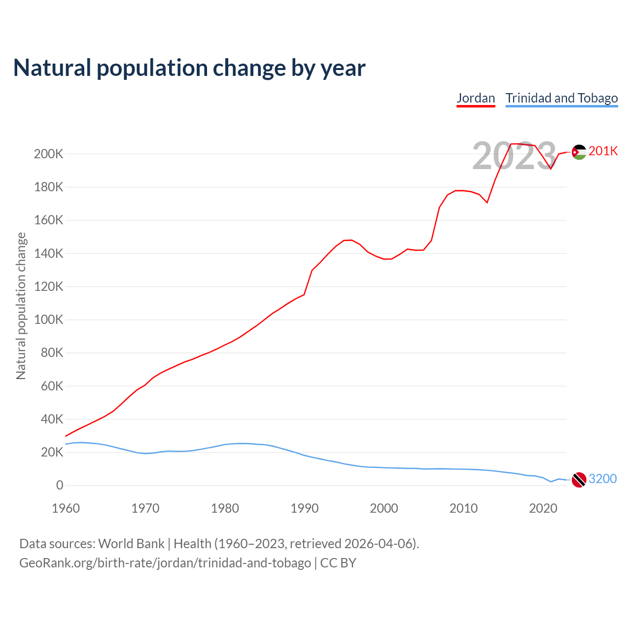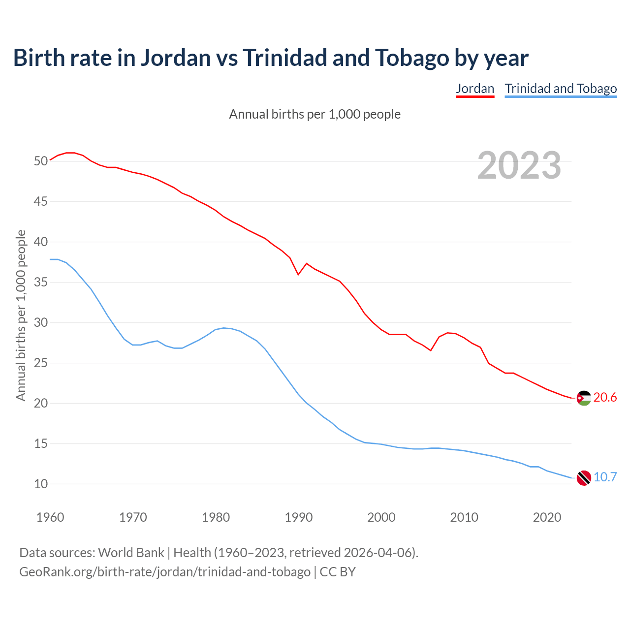 Jordan has an annual birth rate of 20.6 births per 1,000 people, compared to 10.7 for Trinidad and Tobago. The average number of children a woman is expected to have during her lifetime — the fertility rate, is 2.64 in Jordan and 1.53 in Trinidad and Tobago — 41.9% difference.