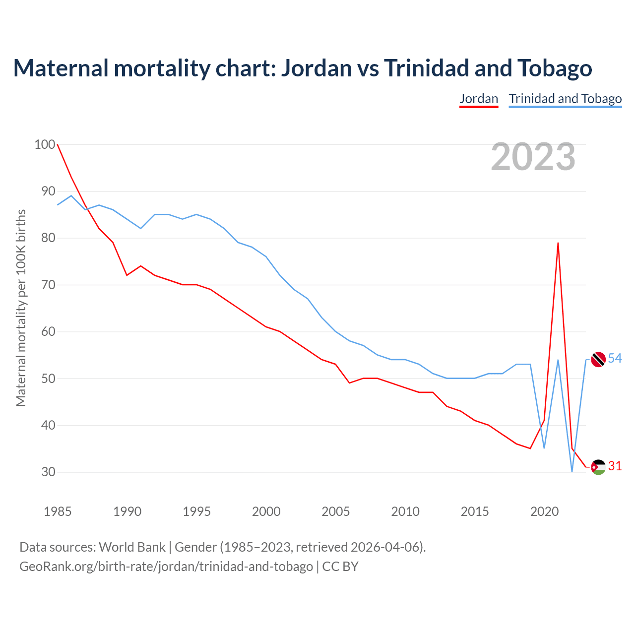 The maternal mortality rate, which is the probability of dying during childbirth or within 42 days of pregnancy termination, is 31 deaths per 100,000 live births in Jordan, compared to 54 deaths in Trinidad and Tobago.