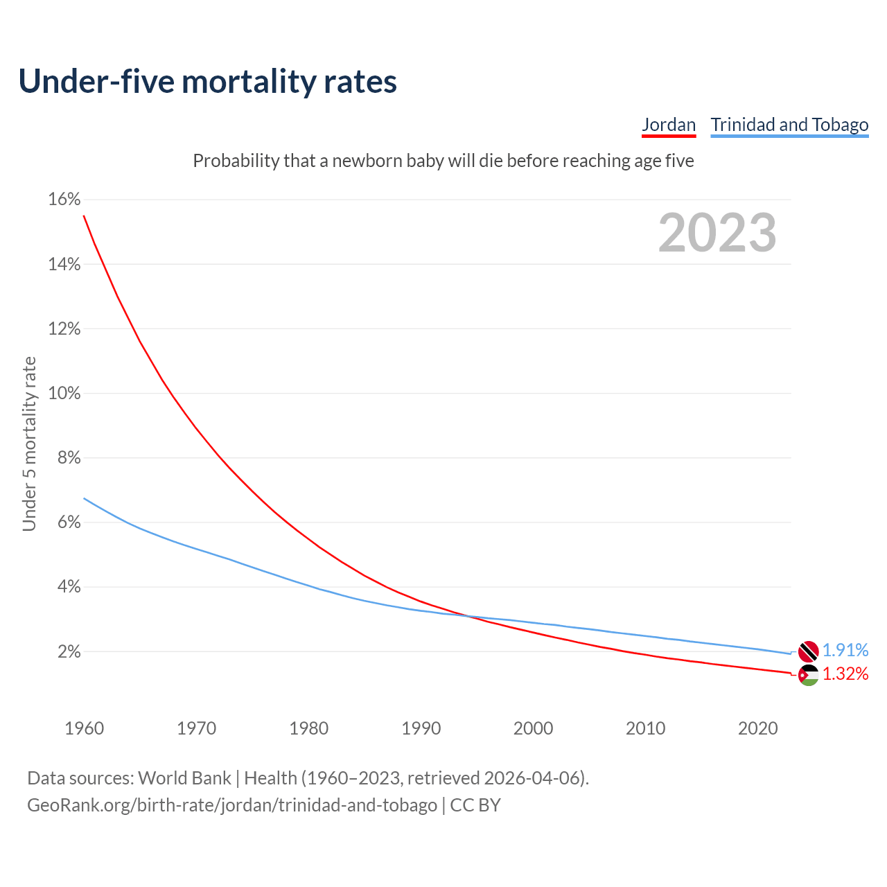 The chance that a newborn baby will die before reaching age five is 1.32% in Jordan and 1.91% in Trinidad and Tobago. Above is a chart with historical data on under-five mortality rates.
