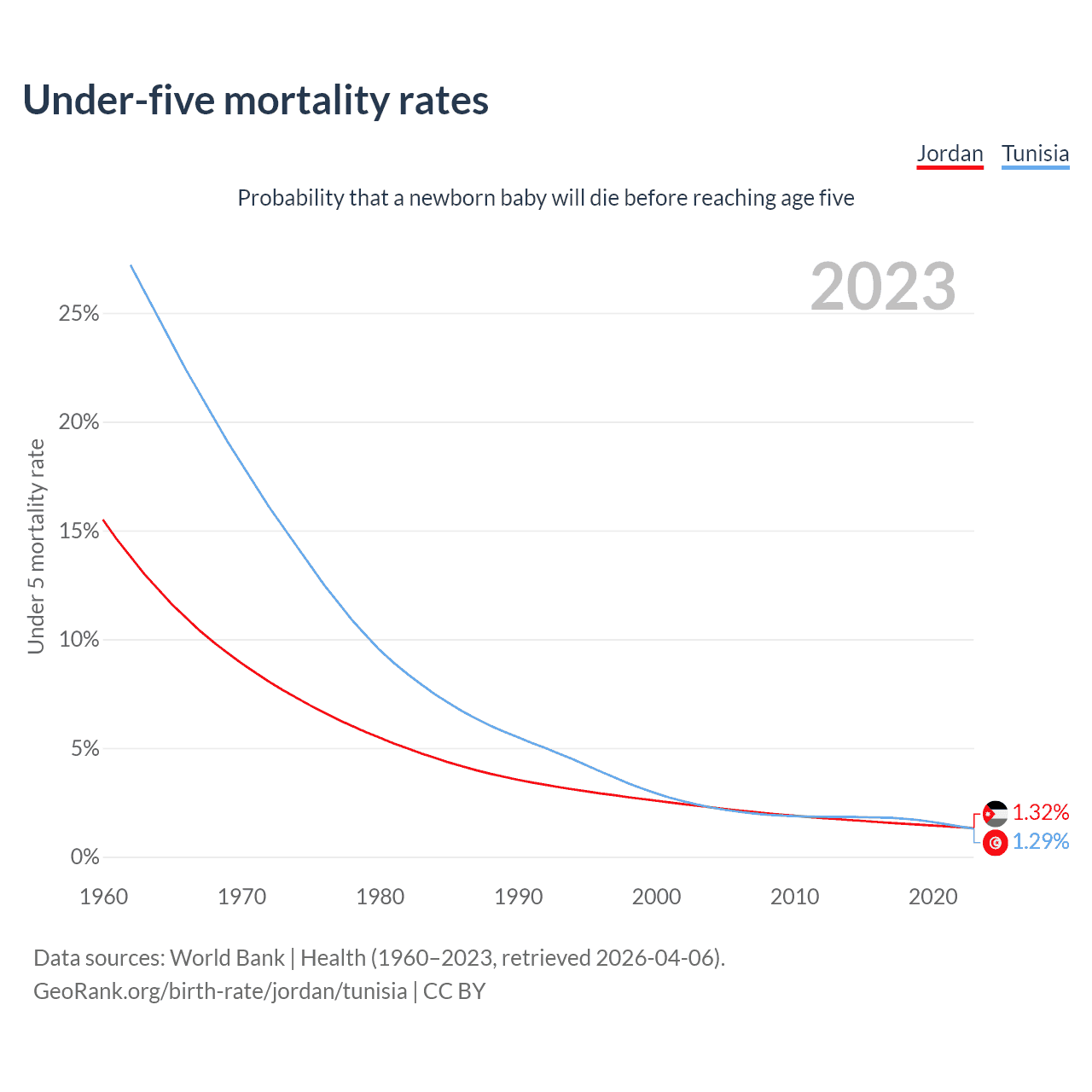 The chance that a newborn baby will die before reaching age five is 1.32% in Jordan and 1.29% in Tunisia. Above is a chart with historical data on under-five mortality rates.