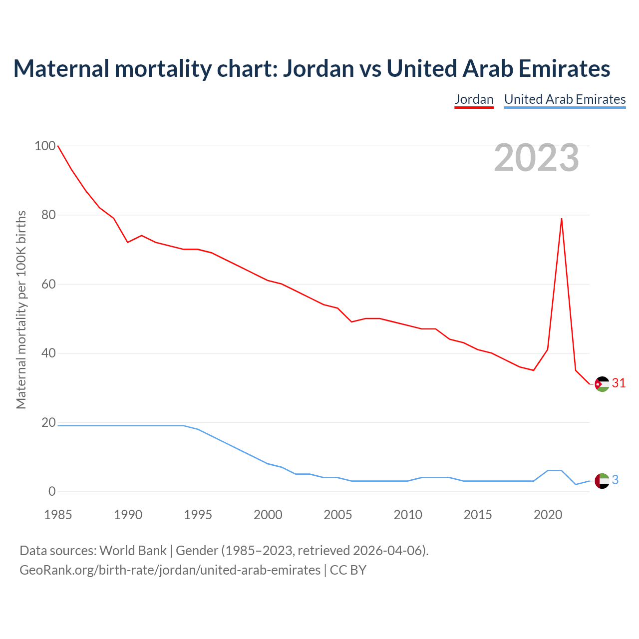 The maternal mortality rate, which is the probability of dying during childbirth or within 42 days of pregnancy termination, is 31 deaths per 100,000 live births in Jordan, compared to 3 deaths in the United Arab Emirates.