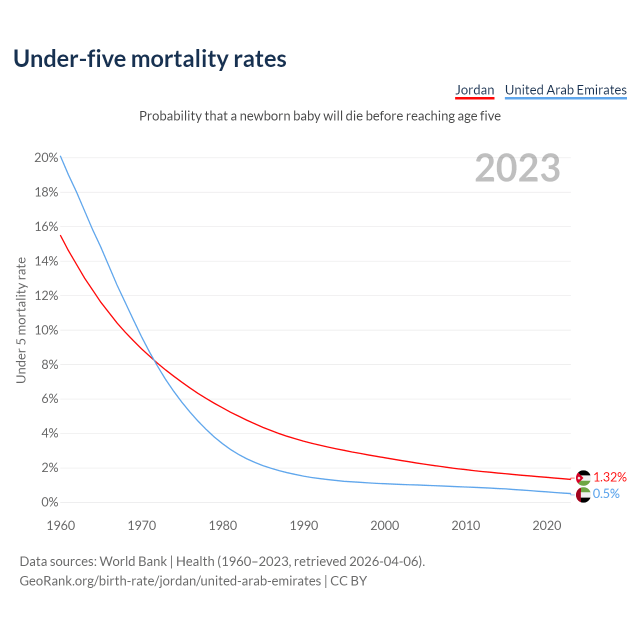 The chance that a newborn baby will die before reaching age five is 1.32% in Jordan and 0.5% in the United Arab Emirates. Above is a chart with historical data on under-five mortality rates.