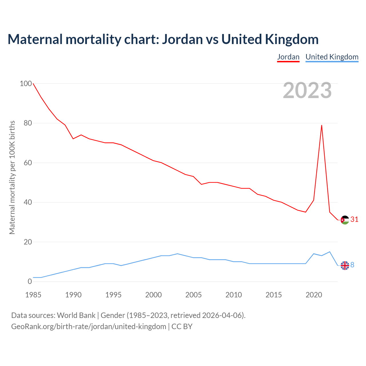 The maternal mortality rate, which is the probability of dying during childbirth or within 42 days of pregnancy termination, is 31 deaths per 100,000 live births in Jordan, compared to 8 deaths in the United Kingdom.