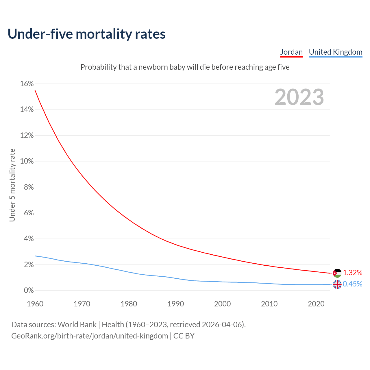 The chance that a newborn baby will die before reaching age five is 1.32% in Jordan and 0.45% in the United Kingdom. Above is a chart with historical data on under-five mortality rates.