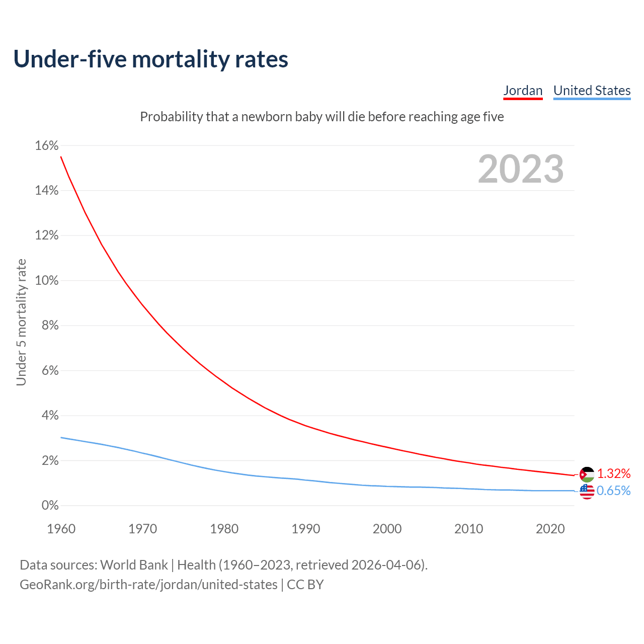 The chance that a newborn baby will die before reaching age five is 1.32% in Jordan and 0.65% in the United States. Above is a chart with historical data on under-five mortality rates.