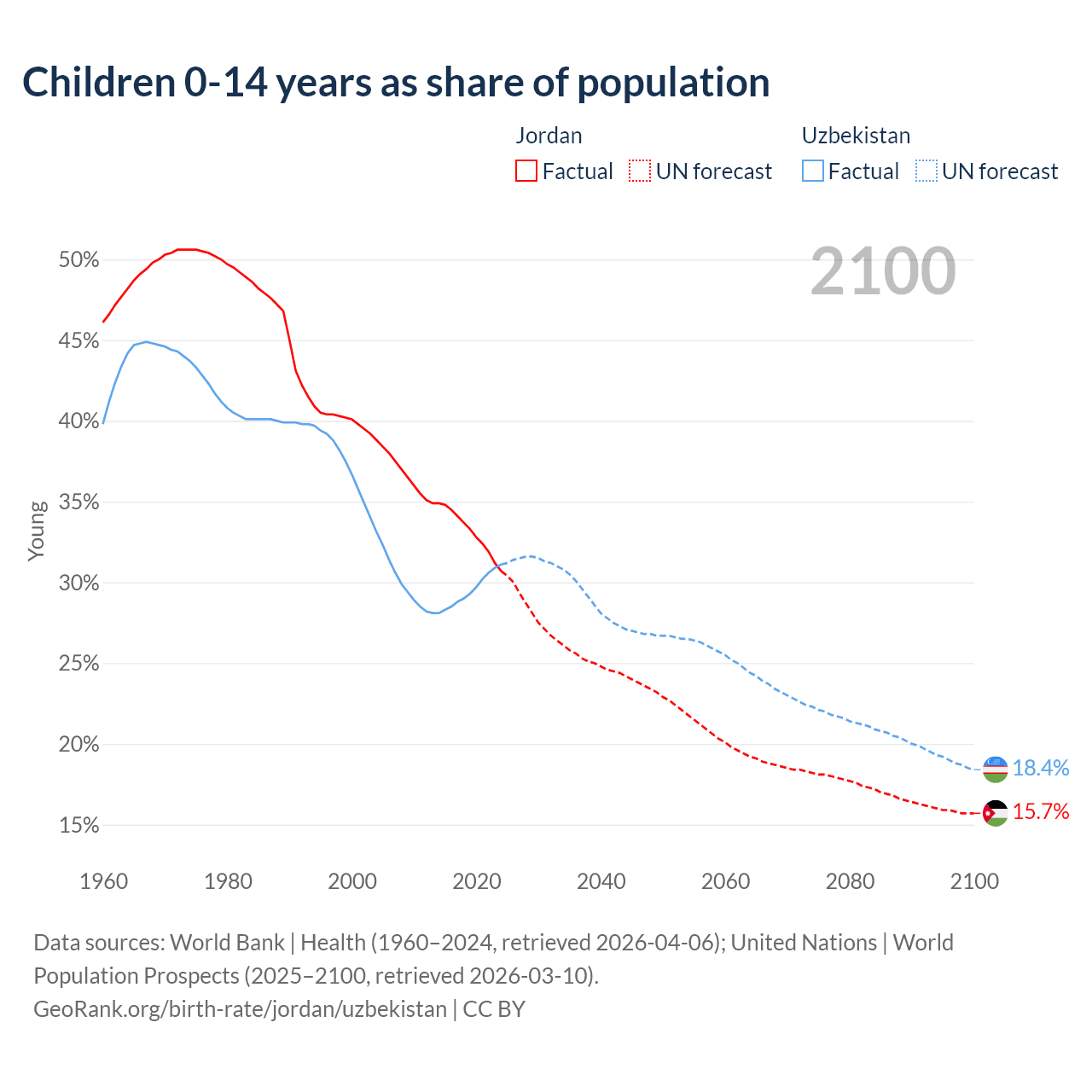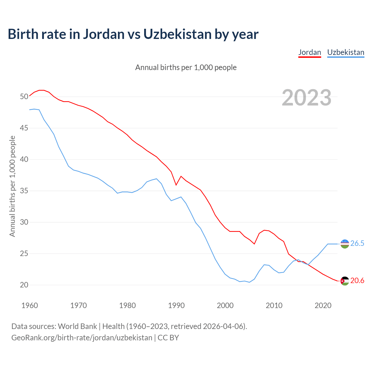 Jordan has an annual birth rate of 20.6 births per 1,000 people, compared to 26.5 for Uzbekistan. The average number of children a woman is expected to have during her lifetime — the fertility rate, is 2.64 in Jordan and 3.5 in Uzbekistan — 32.6% difference.