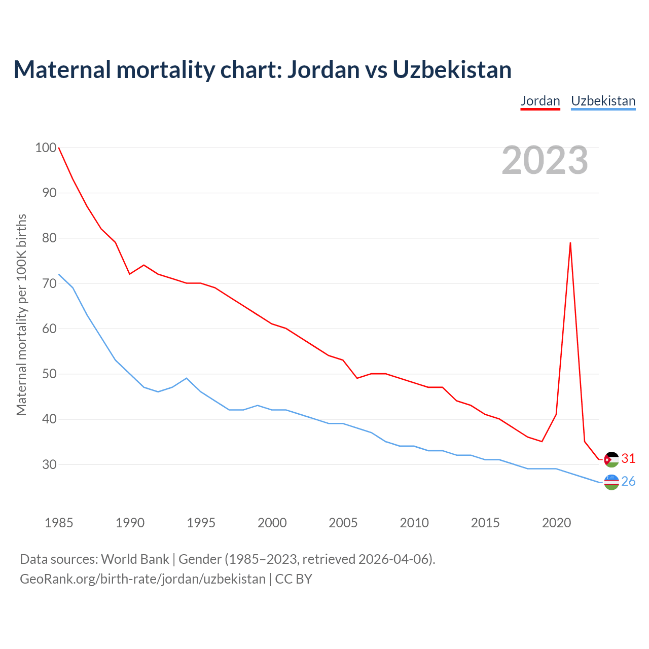 The maternal mortality rate, which is the probability of dying during childbirth or within 42 days of pregnancy termination, is 31 deaths per 100,000 live births in Jordan, compared to 26 deaths in Uzbekistan.