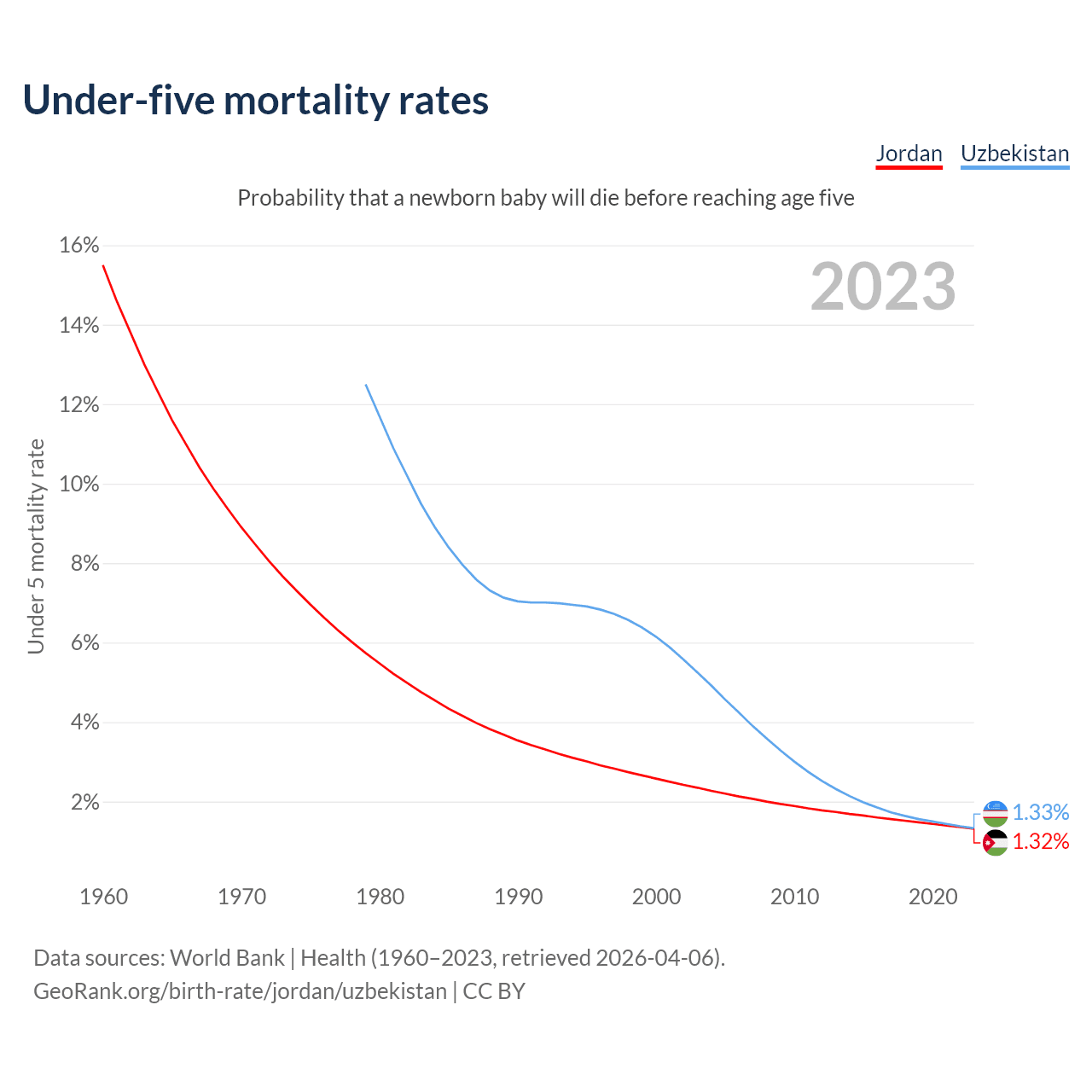 The chance that a newborn baby will die before reaching age five is 1.32% in Jordan and 1.33% in Uzbekistan. Above is a chart with historical data on under-five mortality rates.