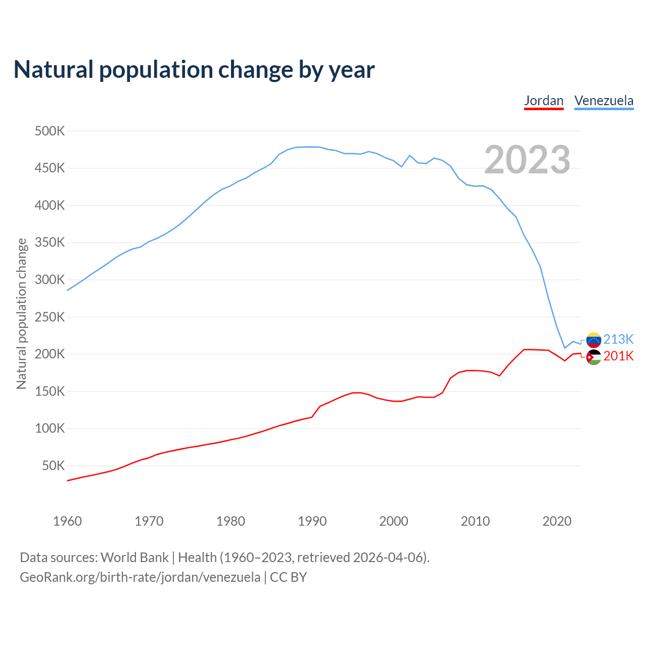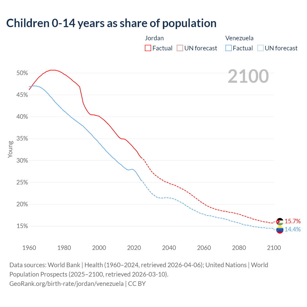 According to the latest available data on birth rates, the fertility rate in Jordan was 2.64 children per woman in 2023, compared to 2.08 in Venezuela in 2023. The replacement level is considered to be 2.1 children per woman.