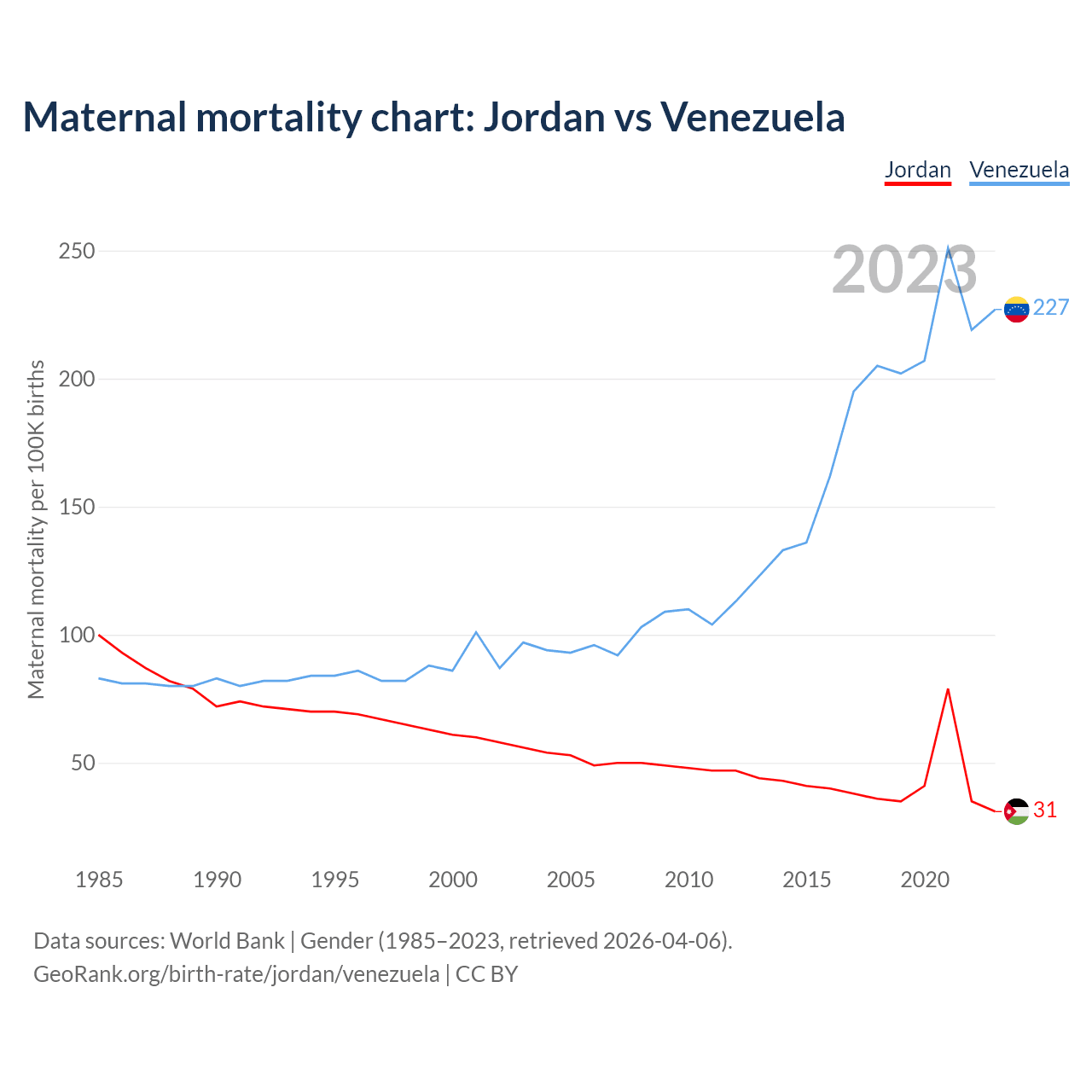 The maternal mortality rate, which is the probability of dying during childbirth or within 42 days of pregnancy termination, is 31 deaths per 100,000 live births in Jordan, compared to 227 deaths in Venezuela.