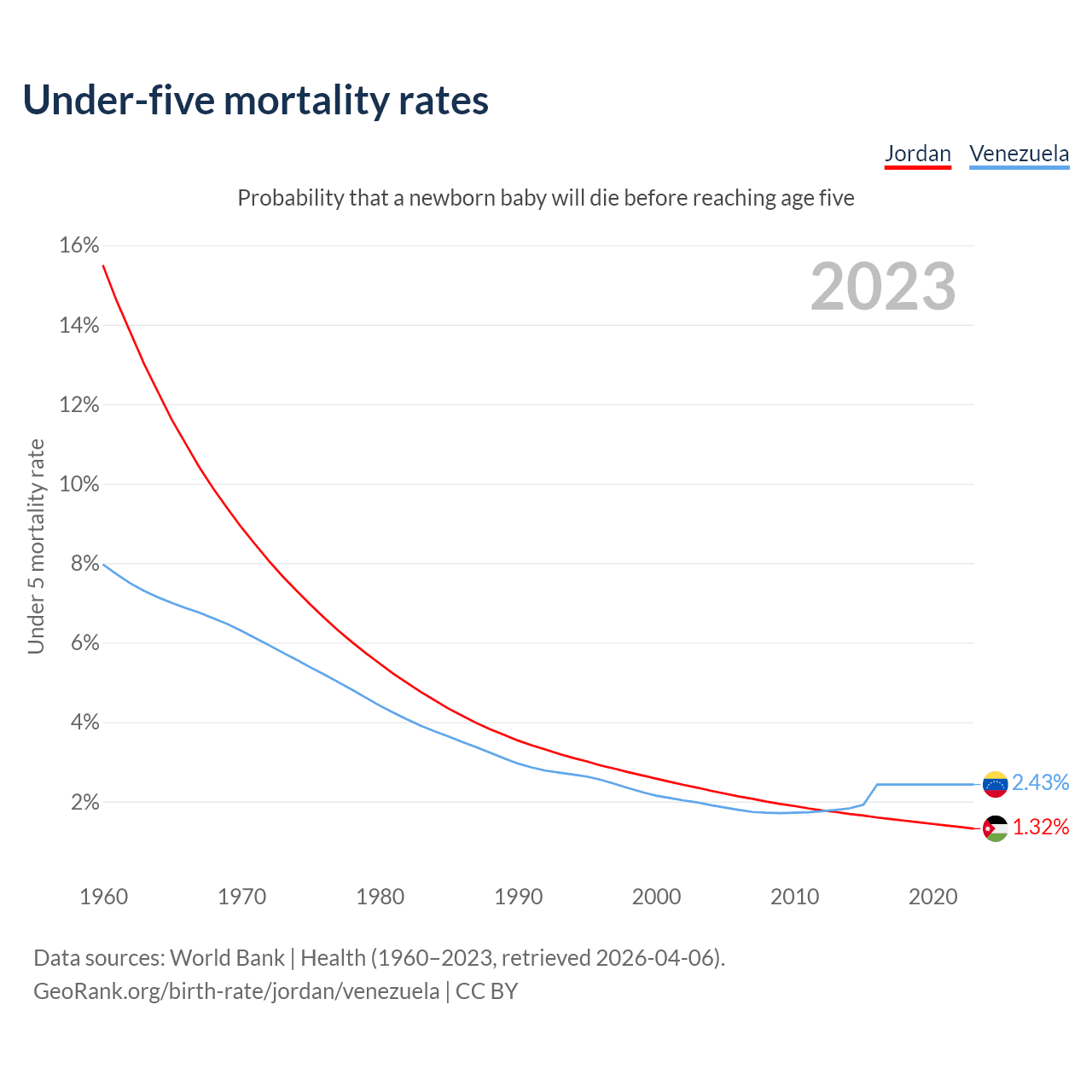 The chance that a newborn baby will die before reaching age five is 1.32% in Jordan and 2.43% in Venezuela. Above is a chart with historical data on under-five mortality rates.