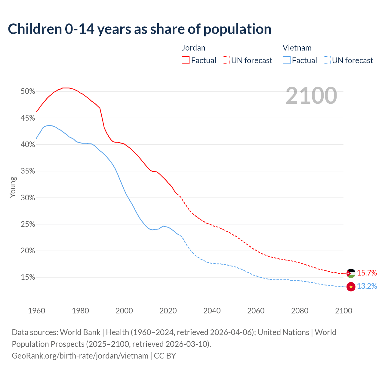 According to the latest available data on birth rates, the fertility rate in Jordan was 2.64 children per woman in 2023, compared to 1.91 in Vietnam in 2023. The replacement level is considered to be 2.1 children per woman.