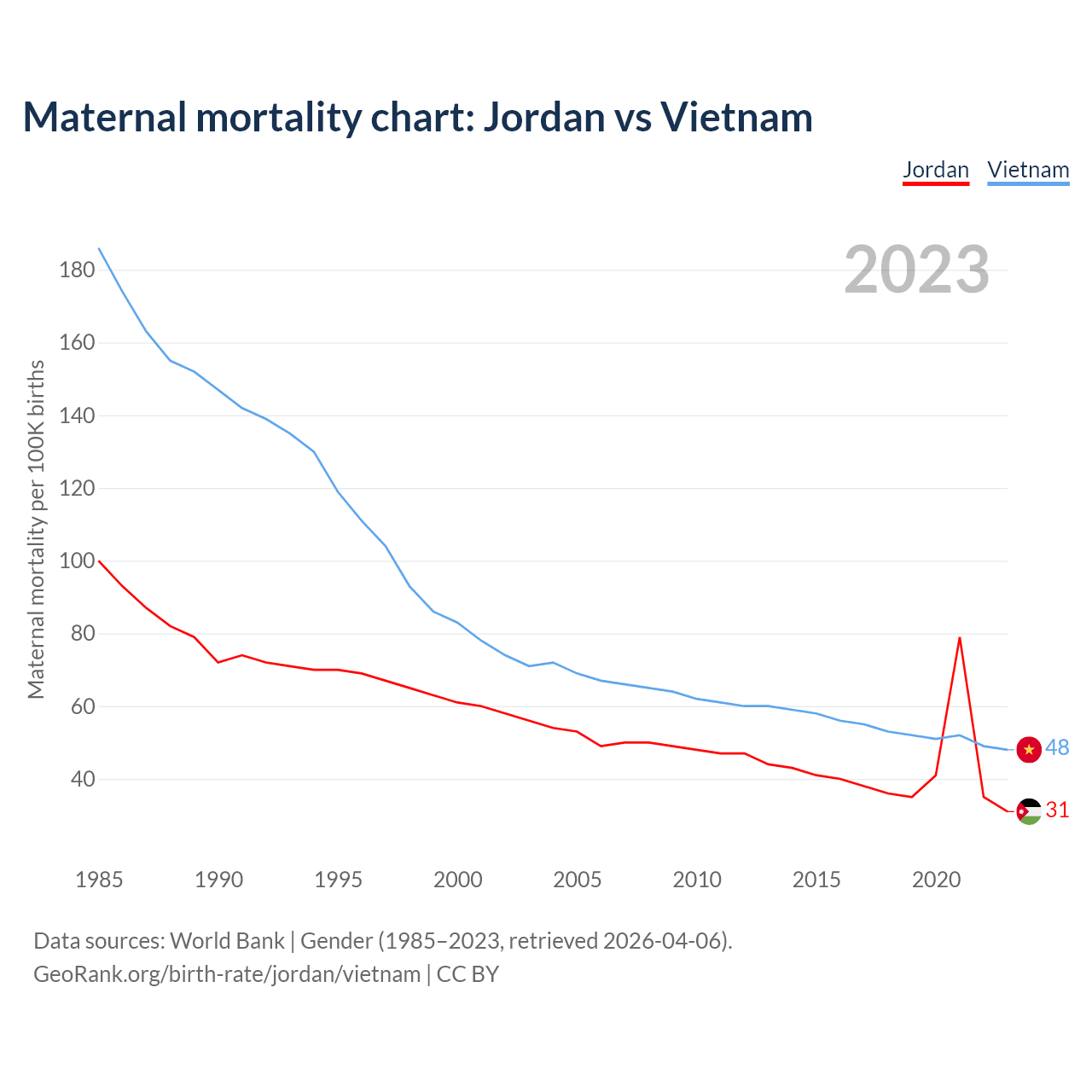 The maternal mortality rate, which is the probability of dying during childbirth or within 42 days of pregnancy termination, is 31 deaths per 100,000 live births in Jordan, compared to 48 deaths in Vietnam.
