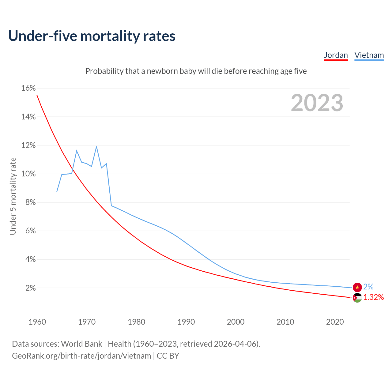 The chance that a newborn baby will die before reaching age five is 1.32% in Jordan and 2% in Vietnam. Above is a chart with historical data on under-five mortality rates.