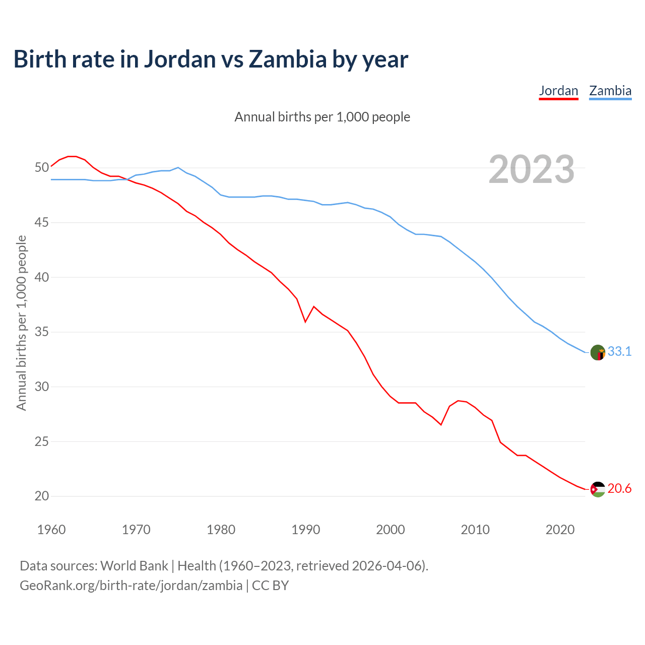 Jordan has an annual birth rate of 20.6 births per 1,000 people, compared to 33.1 for Zambia. The average number of children a woman is expected to have during her lifetime — the fertility rate, is 2.64 in Jordan and 4.1 in Zambia — 55.4% difference.