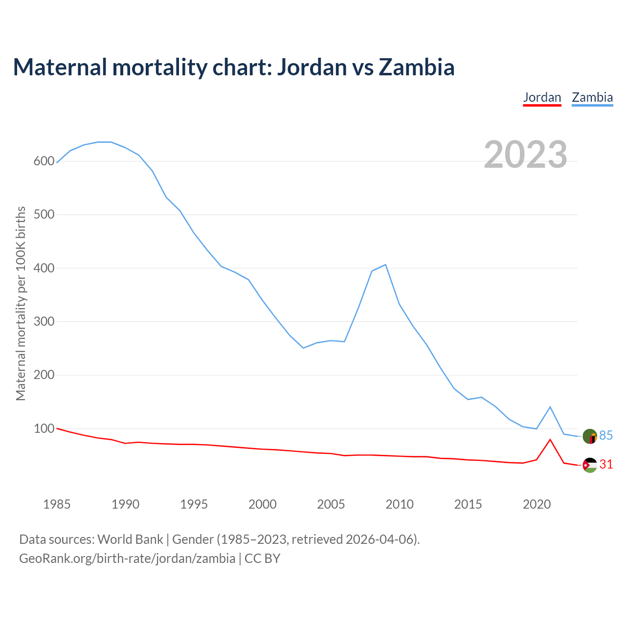 The maternal mortality rate, which is the probability of dying during childbirth or within 42 days of pregnancy termination, is 31 deaths per 100,000 live births in Jordan, compared to 85 deaths in Zambia.