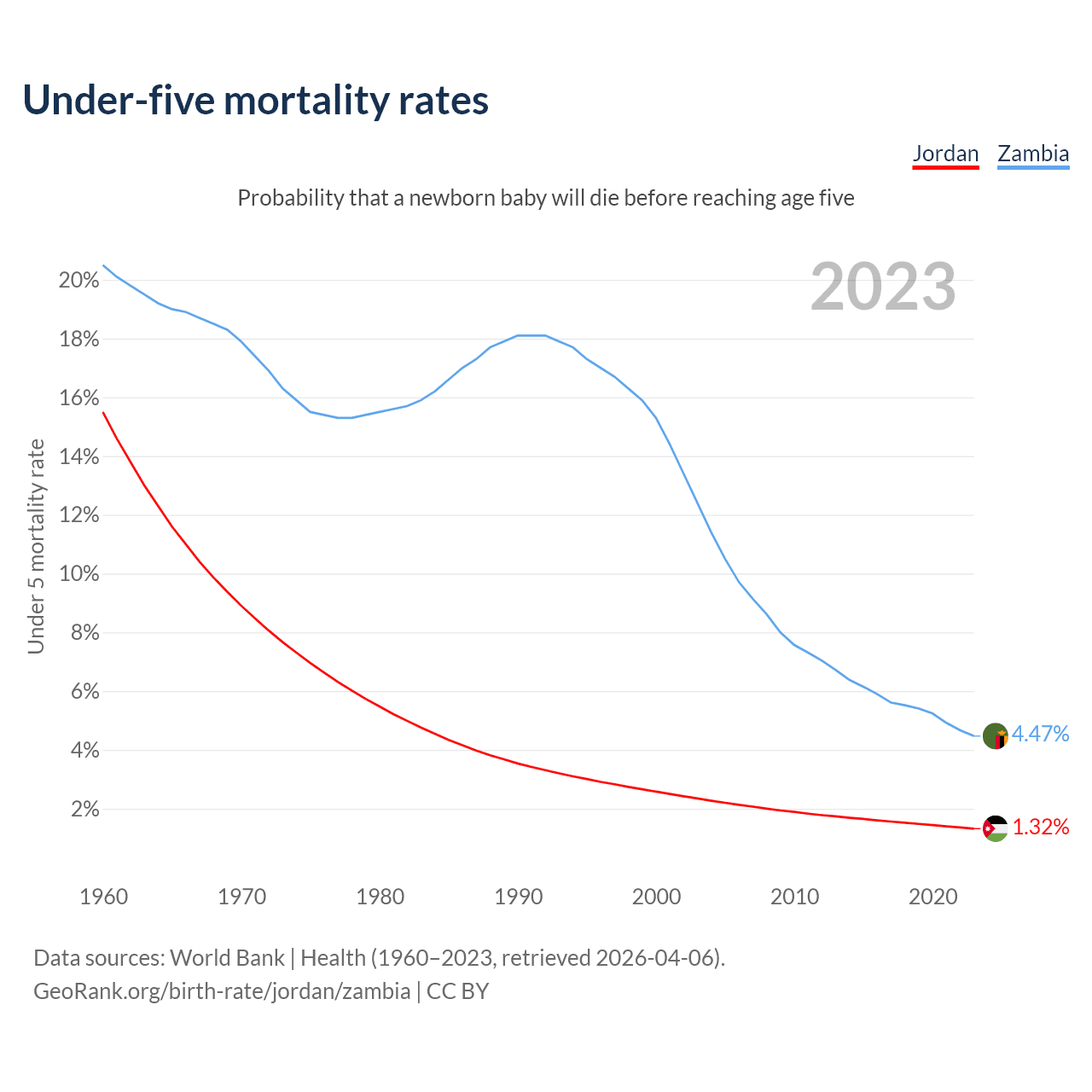The chance that a newborn baby will die before reaching age five is 1.32% in Jordan and 4.47% in Zambia. Above is a chart with historical data on under-five mortality rates.