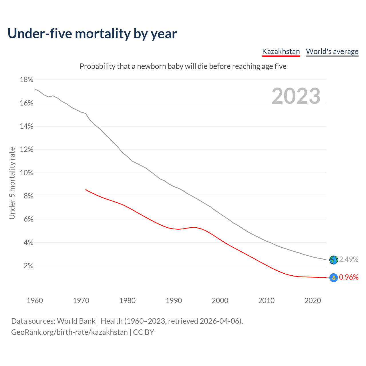 The under-5 mortality rate in Kazakhstan was 9.6 deaths per 1,000 live births in 2023 — a 0.96% chance that a newborn baby will die before reaching age five. This is down from 42.5 deaths per 1,000 live births in 2000.