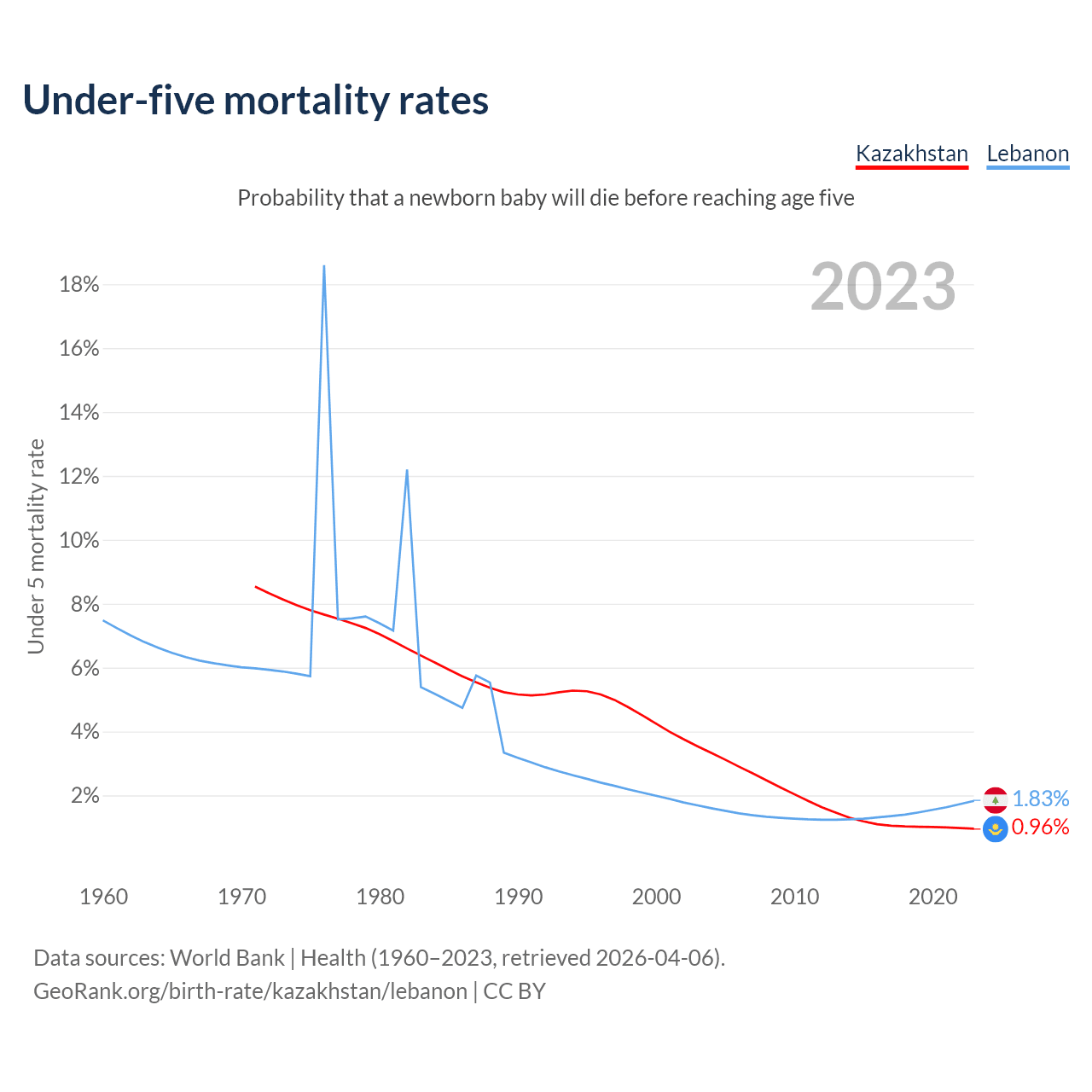 The chance that a newborn baby will die before reaching age five is 0.96% in Kazakhstan and 1.83% in Lebanon. Above is a chart with historical data on under-five mortality rates.