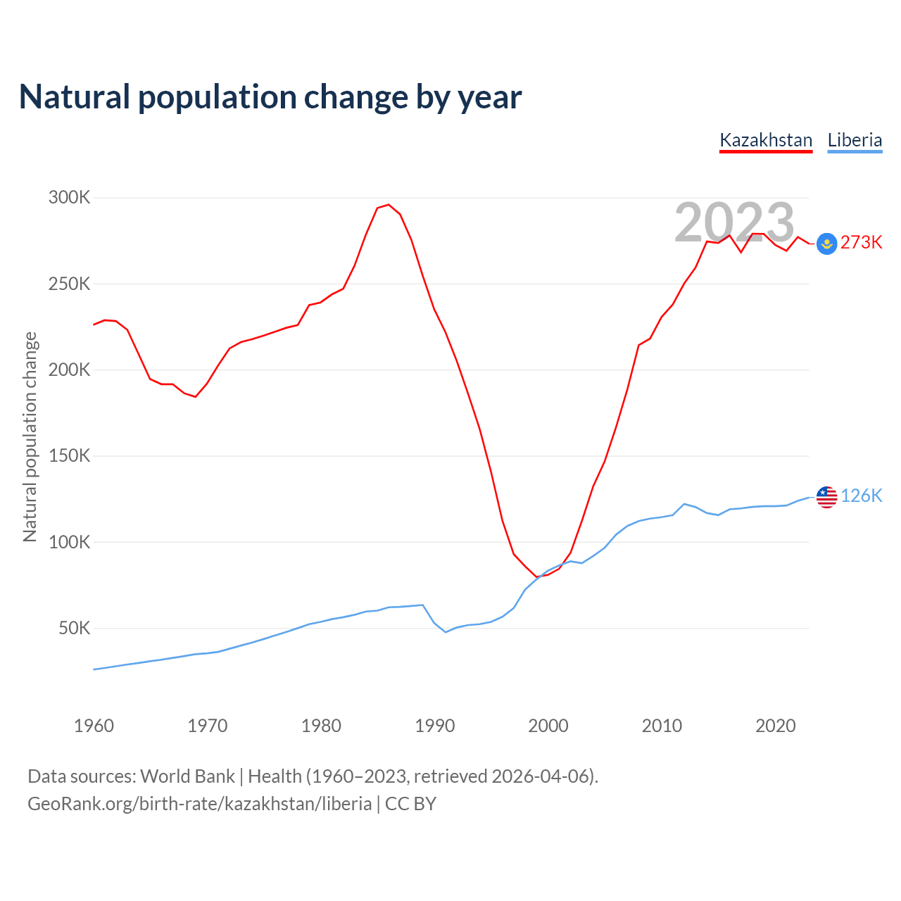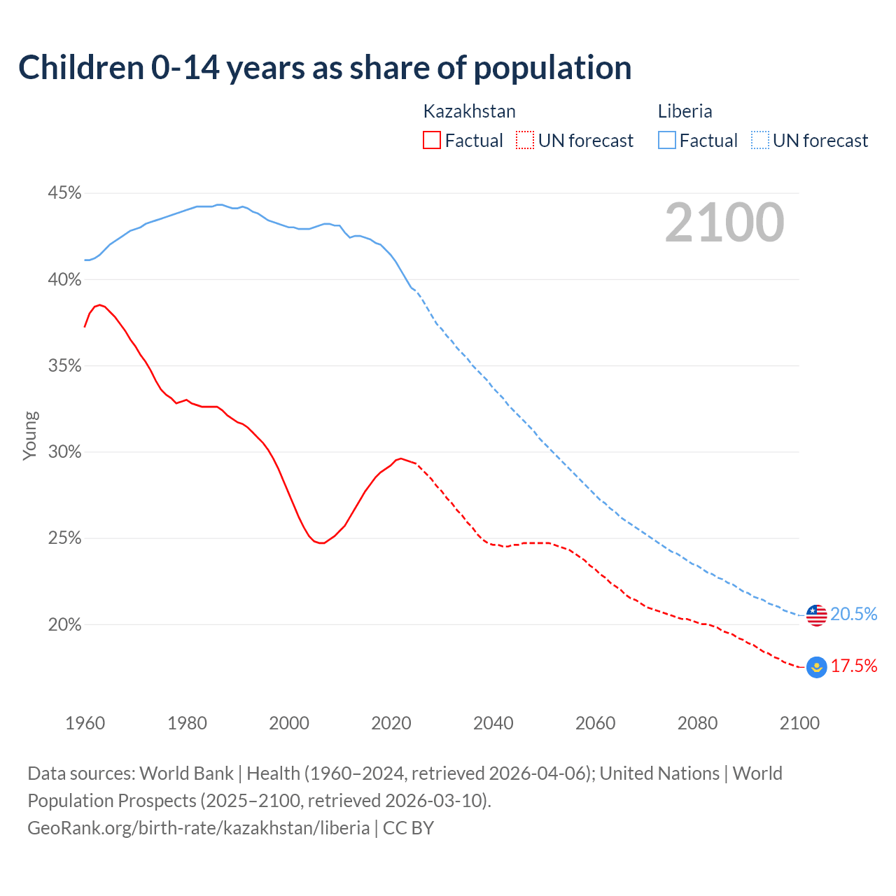 According to the latest available data on birth rates, the fertility rate in Kazakhstan was 3.01 children per woman in 2023, compared to 3.95 in Liberia in 2023. The replacement level is considered to be 2.1 children per woman.