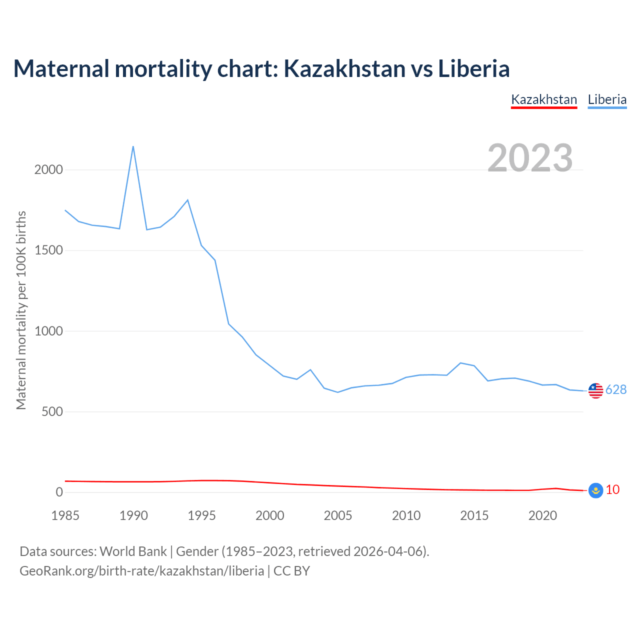 - Annual births per 1,000 women ages 15-19 (adolescent birth rate or teenage mother rate) is 18.2 in Kazakhstan vs 126 in Liberia.
