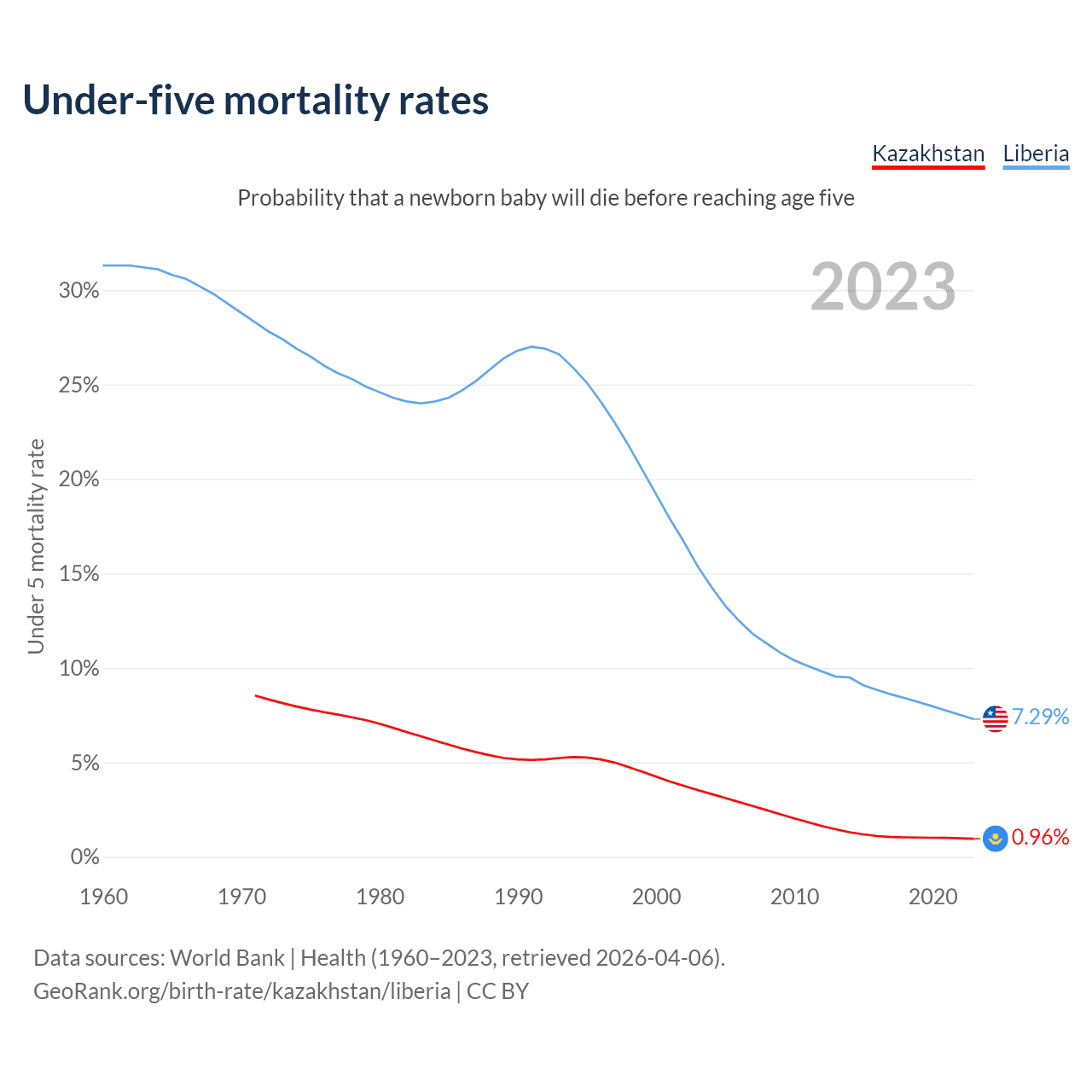 The chance that a newborn baby will die before reaching age five is 0.96% in Kazakhstan and 7.29% in Liberia. Above is a chart with historical data on under-five mortality rates.
