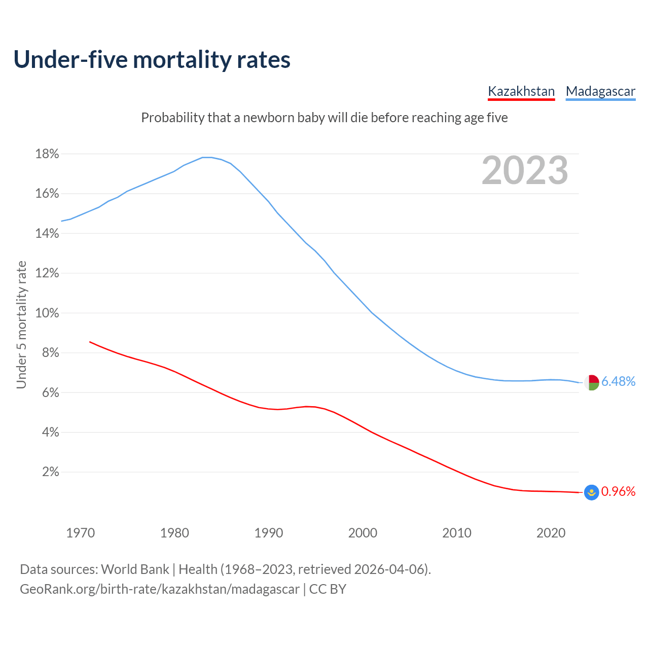 The chance that a newborn baby will die before reaching age five is 0.96% in Kazakhstan and 6.48% in Madagascar. Above is a chart with historical data on under-five mortality rates.